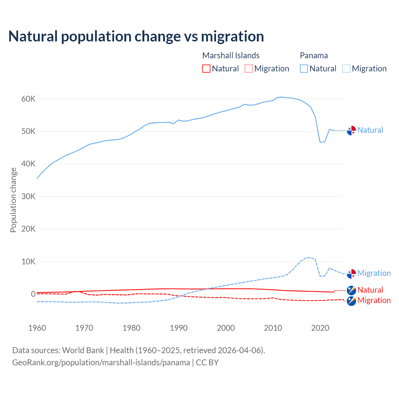 Over the last 10 years, 27.8% of the population change in the Marshall Islands is from natural causes (a gain of 7,592 people) and 72.2% is from migration (a loss of 19,682 people). In Panama 86.5% is from natural causes (a gain of 544,211 people) and 13.5% is from migration (a gain of 84,849 people).