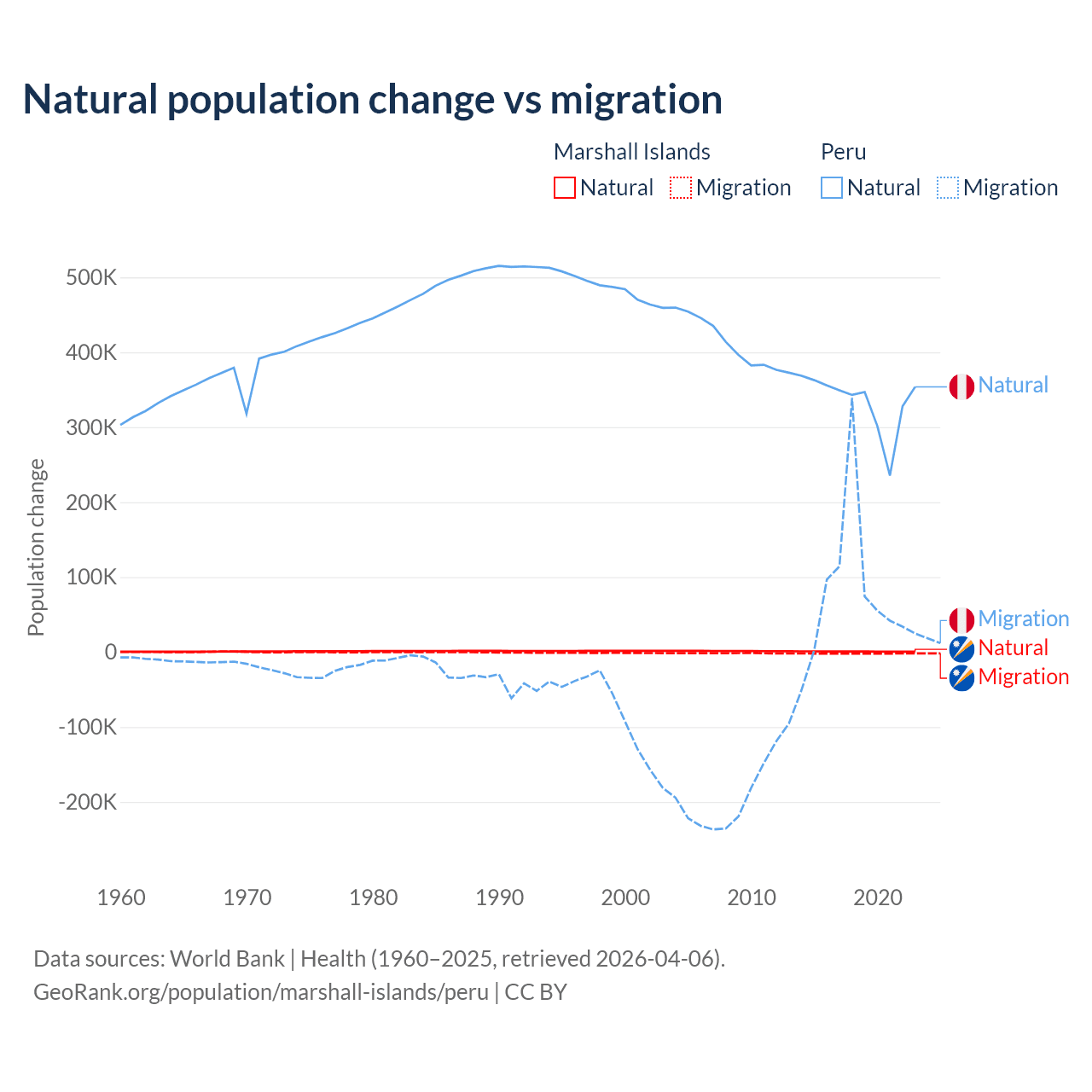 Over the last 10 years, 27.8% of the population change in the Marshall Islands is from natural causes (a gain of 7,592 people) and 72.2% is from migration (a loss of 19,682 people). In Peru 82% is from natural causes (a gain of 3,345,822 people) and 18% is from migration (a gain of 732,505 people).