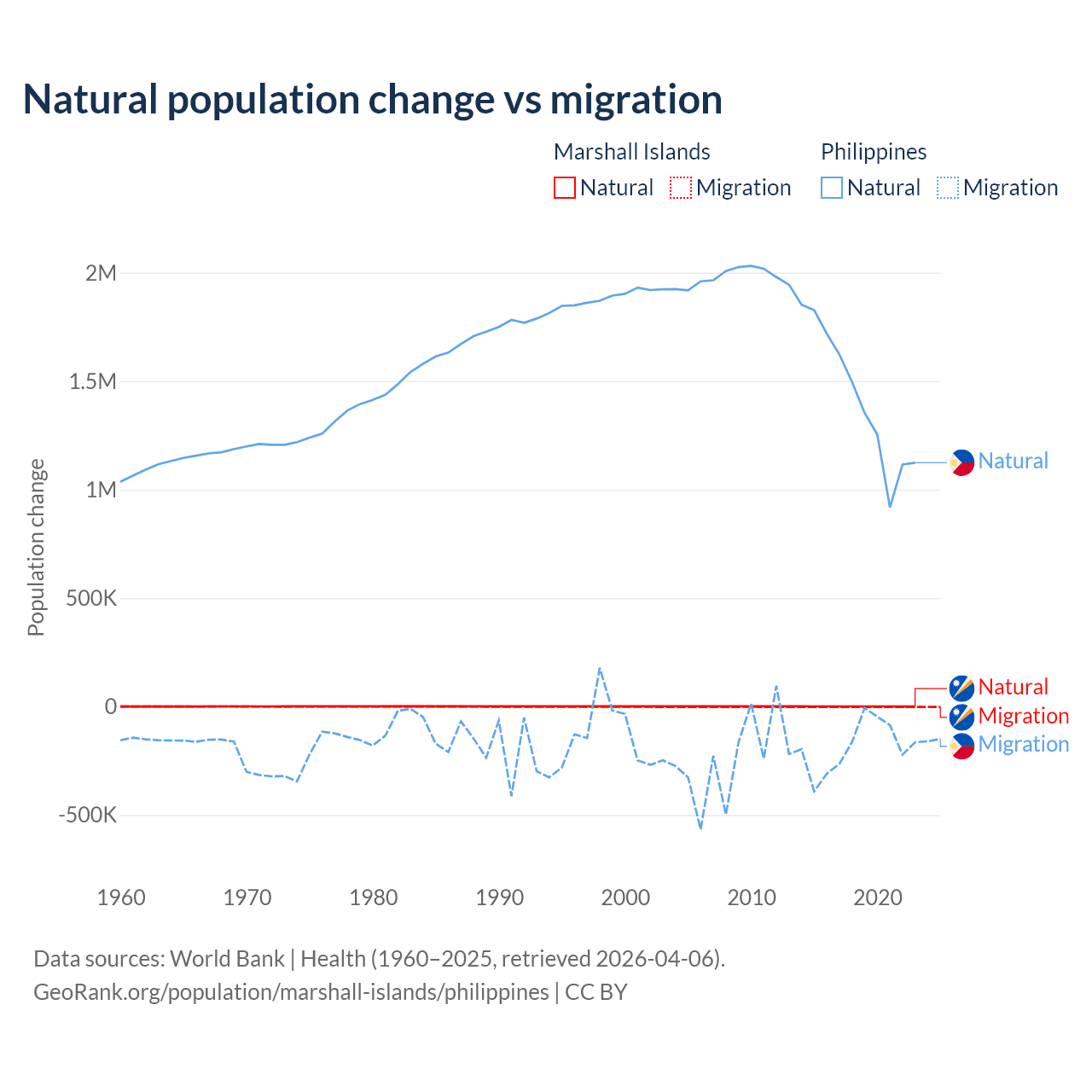 Over the last 10 years, 27.8% of the population change in the Marshall Islands is from natural causes (a gain of 7,592 people) and 72.2% is from migration (a loss of 19,682 people). In the Philippines 88.5% is from natural causes (a gain of 14,279,705 people) and 11.5% is from migration (a loss of 1,848,117 people).