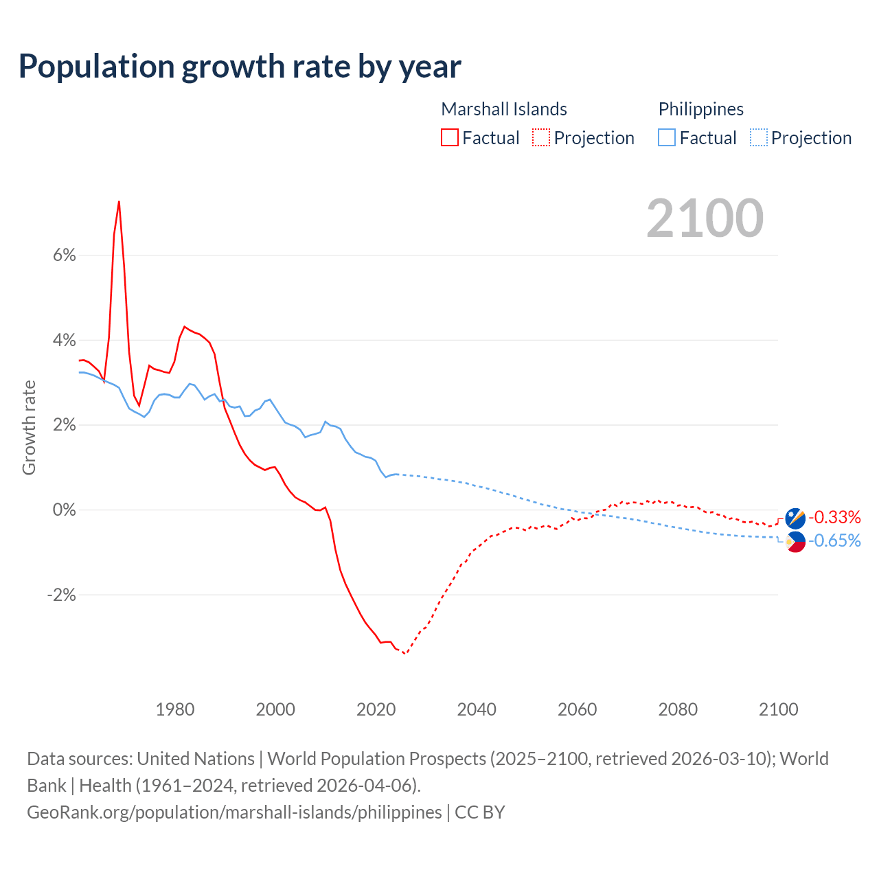 Data sources: World Bank | Health (1960–2024, retrieved 2026-04-06); United Nations | World Population Prospects (1960–2026, retrieved 2026-03-10); U.S. Census Bureau (1960–2025, retrieved 2026-02-08); Central Intelligence Agency (CIA) (2000–2019, retrieved 2026-02-20).