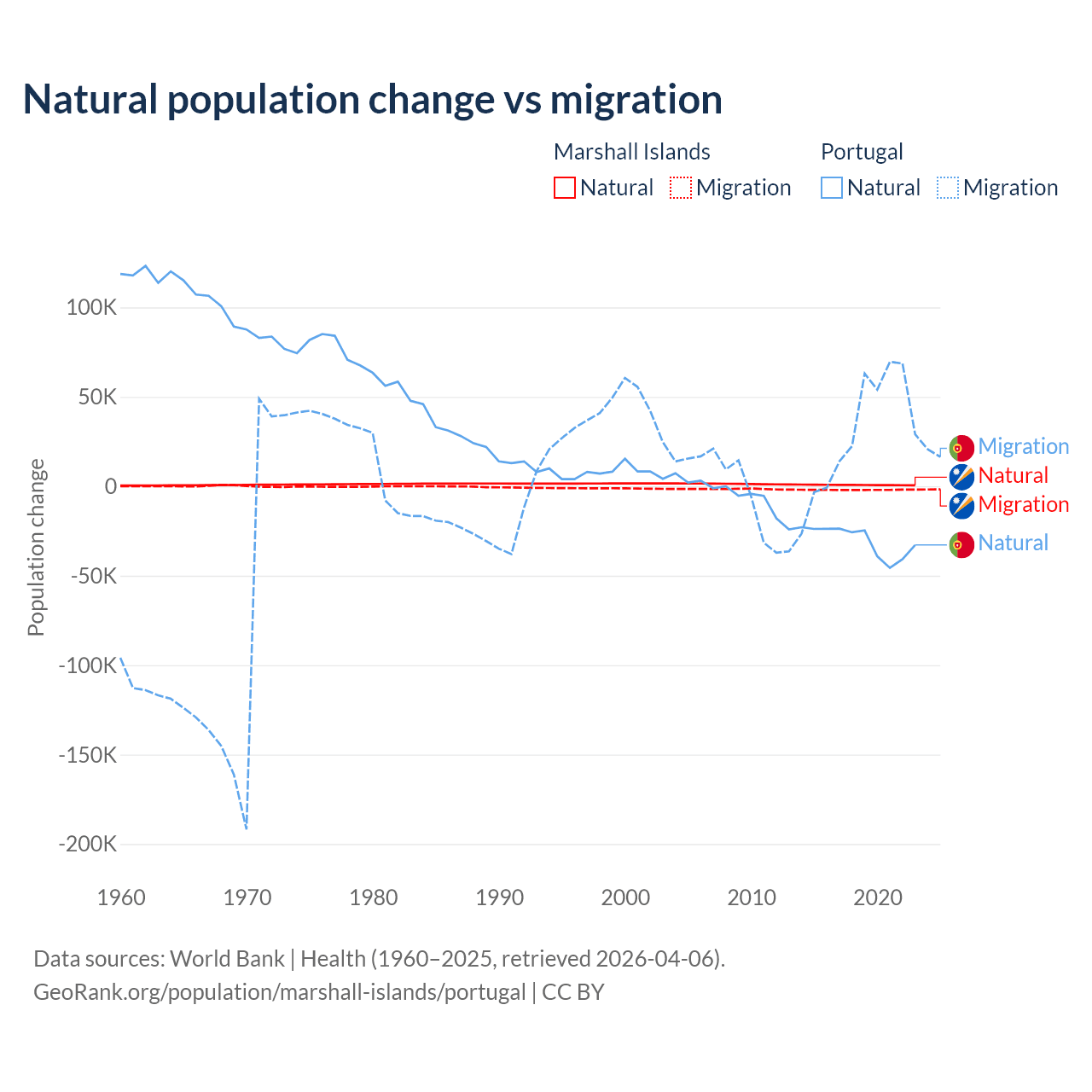 Over the last 10 years, 27.8% of the population change in the Marshall Islands is from natural causes (a gain of 7,592 people) and 72.2% is from migration (a loss of 19,682 people). In Portugal 51% is from natural causes (a loss of 302,748 people) and 49% is from migration (a gain of 290,554 people).