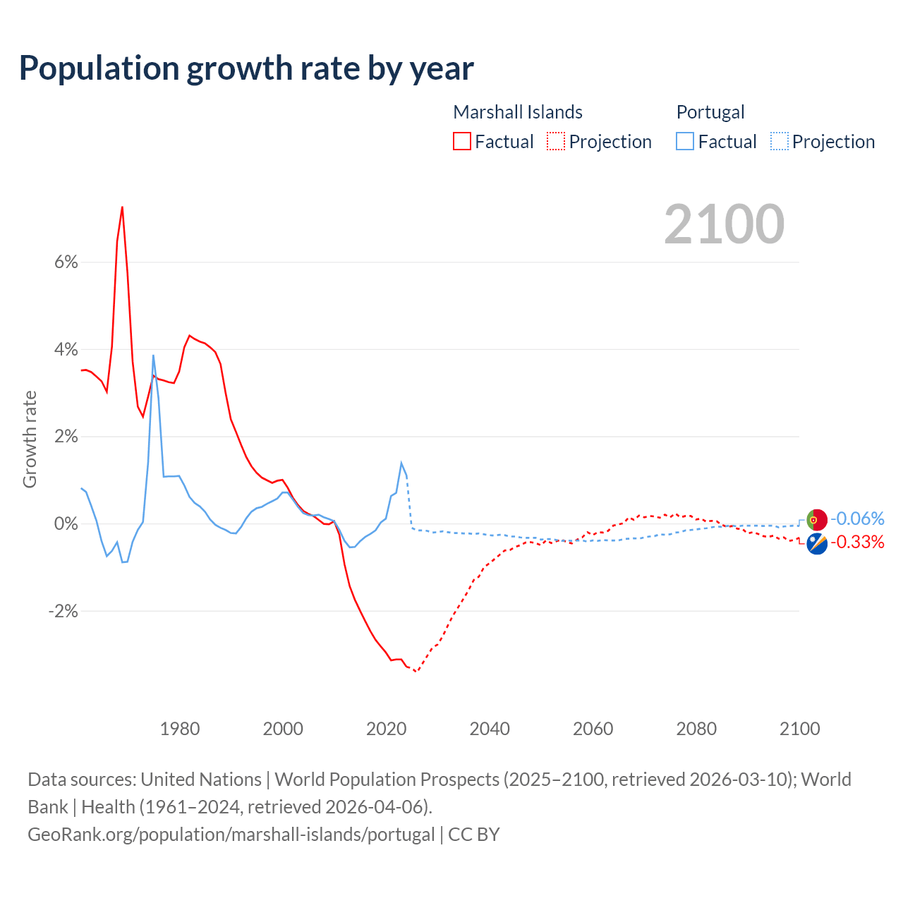 - For the last 10 years, the Marshall Islands has had an average growth rate of -2.69% per year vs +0.21% in Portugal.