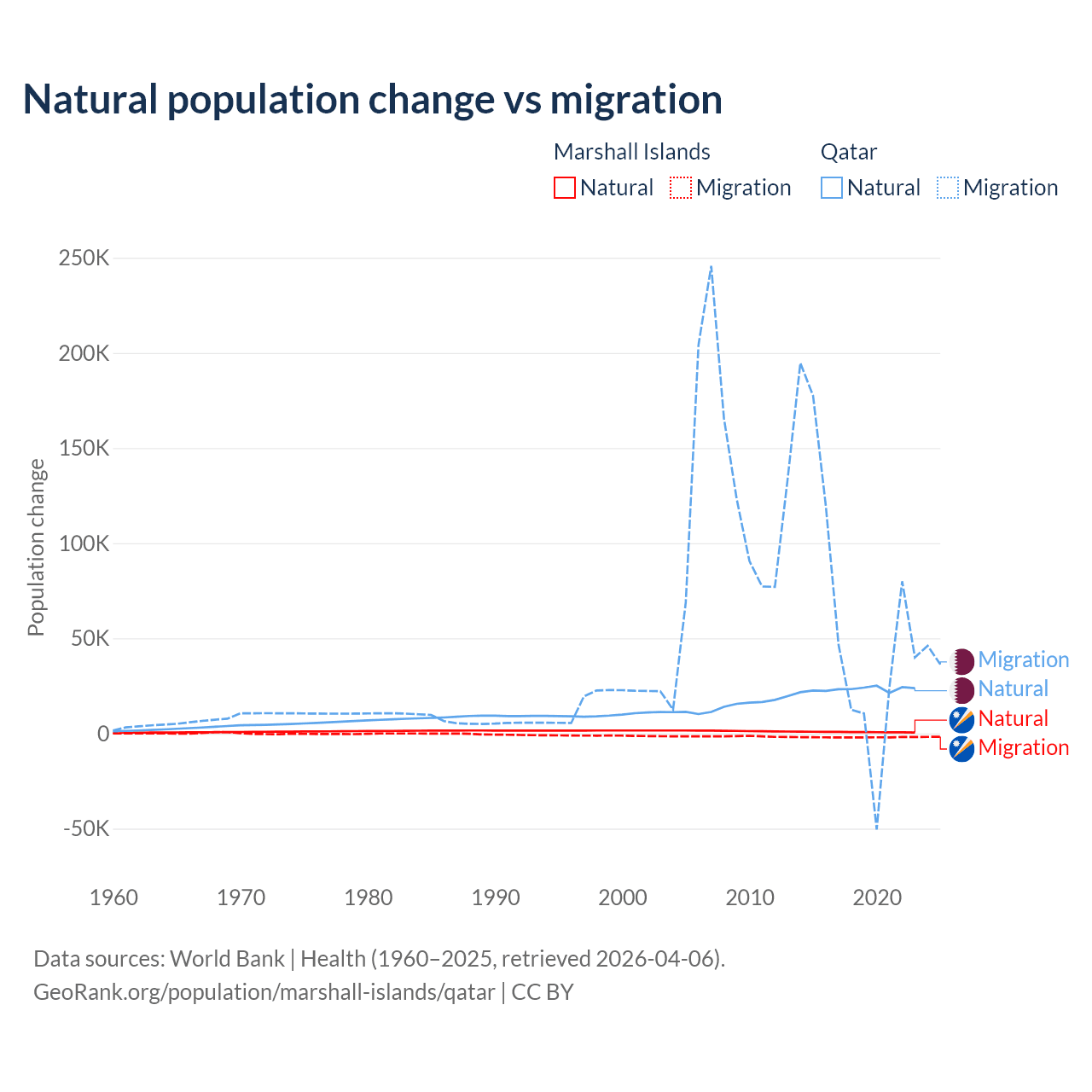 Over the last 10 years, 27.8% of the population change in the Marshall Islands is from natural causes (a gain of 7,592 people) and 72.2% is from migration (a loss of 19,682 people). In Qatar 26.1% is from natural causes (a gain of 232,009 people) and 73.9% is from migration (a gain of 655,712 people).