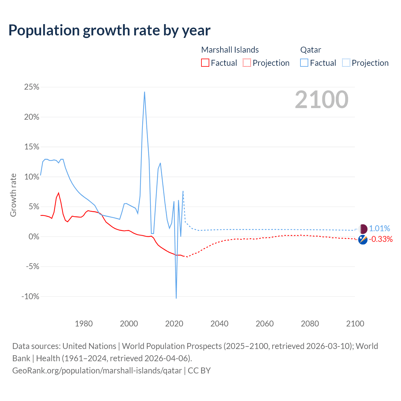 - For the last 10 years, the Marshall Islands has had an average growth rate of -2.69% per year vs +3.86% in Qatar.