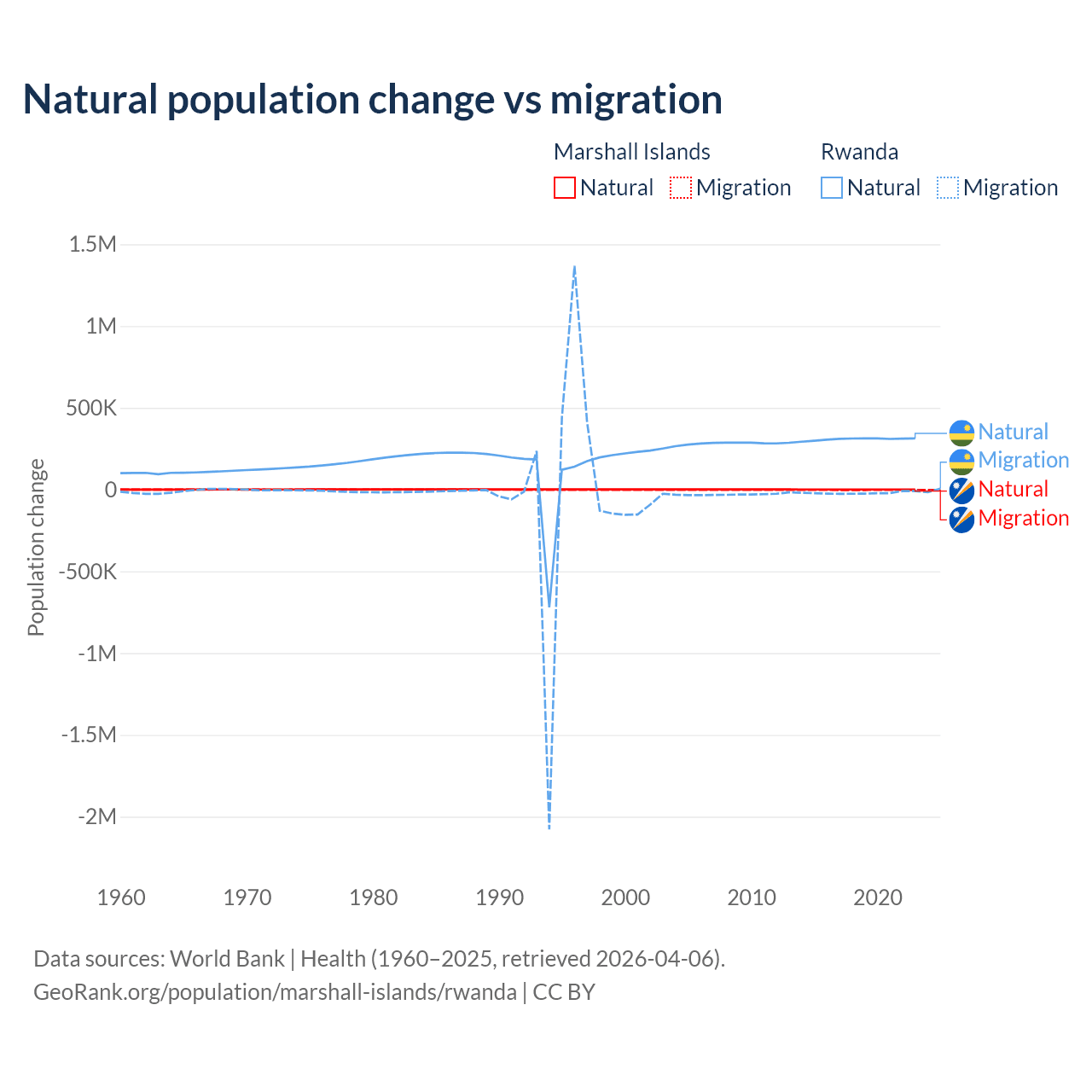 Over the last 10 years, 27.8% of the population change in the Marshall Islands is from natural causes (a gain of 7,592 people) and 72.2% is from migration (a loss of 19,682 people). In Rwanda 93.8% is from natural causes (a gain of 3,081,296 people) and 6.18% is from migration (a loss of 203,035 people).