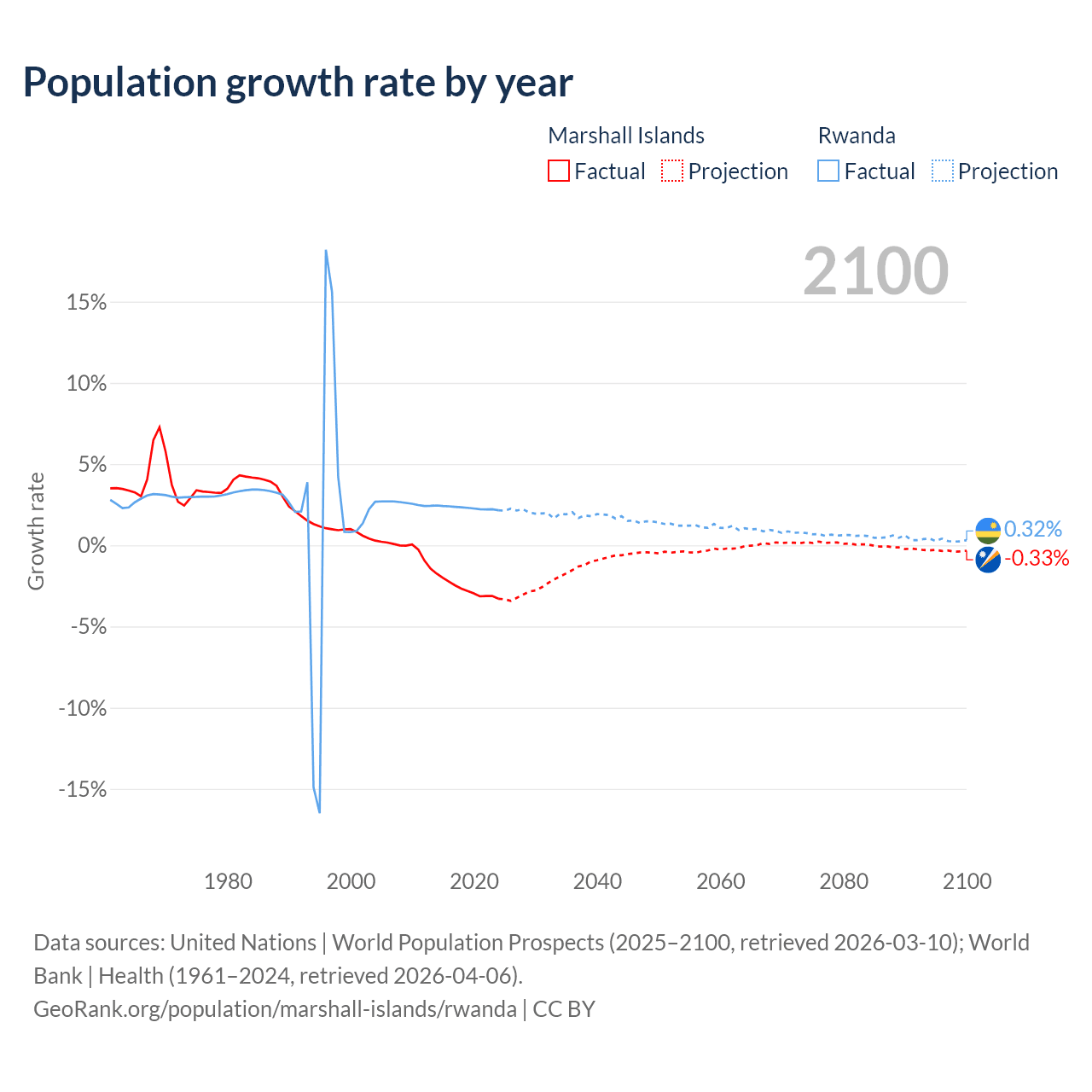 - For the last 10 years, the Marshall Islands has had an average growth rate of -2.69% per year vs +2.31% in Rwanda.