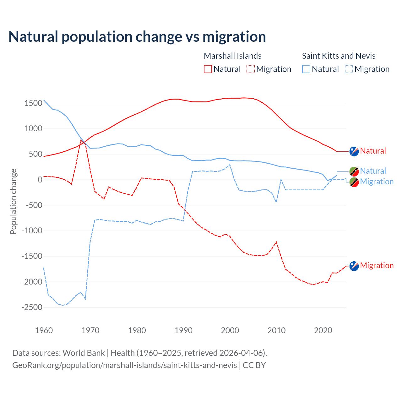 Over the last 10 years, 27.8% of the population change in the Marshall Islands is from natural causes (a gain of 7,592 people) and 72.2% is from migration (a loss of 19,682 people). In Saint Kitts and Nevis 44.9% is from natural causes (a gain of 1,225 people) and 55.1% is from migration (a loss of 1,506 people).
