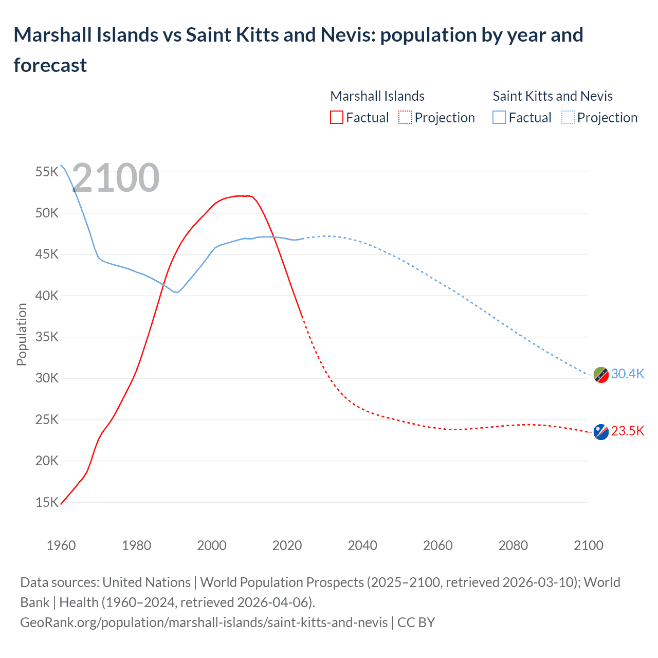 Marshall Islands vs Saint Kitts and Nevis: population by year and forecast