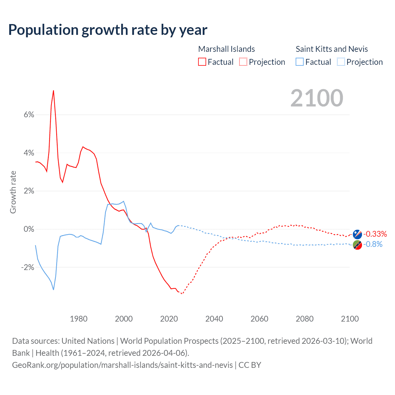 - For the last 10 years, the Marshall Islands has had an average growth rate of -2.69% per year vs -0.04% in Saint Kitts and Nevis.