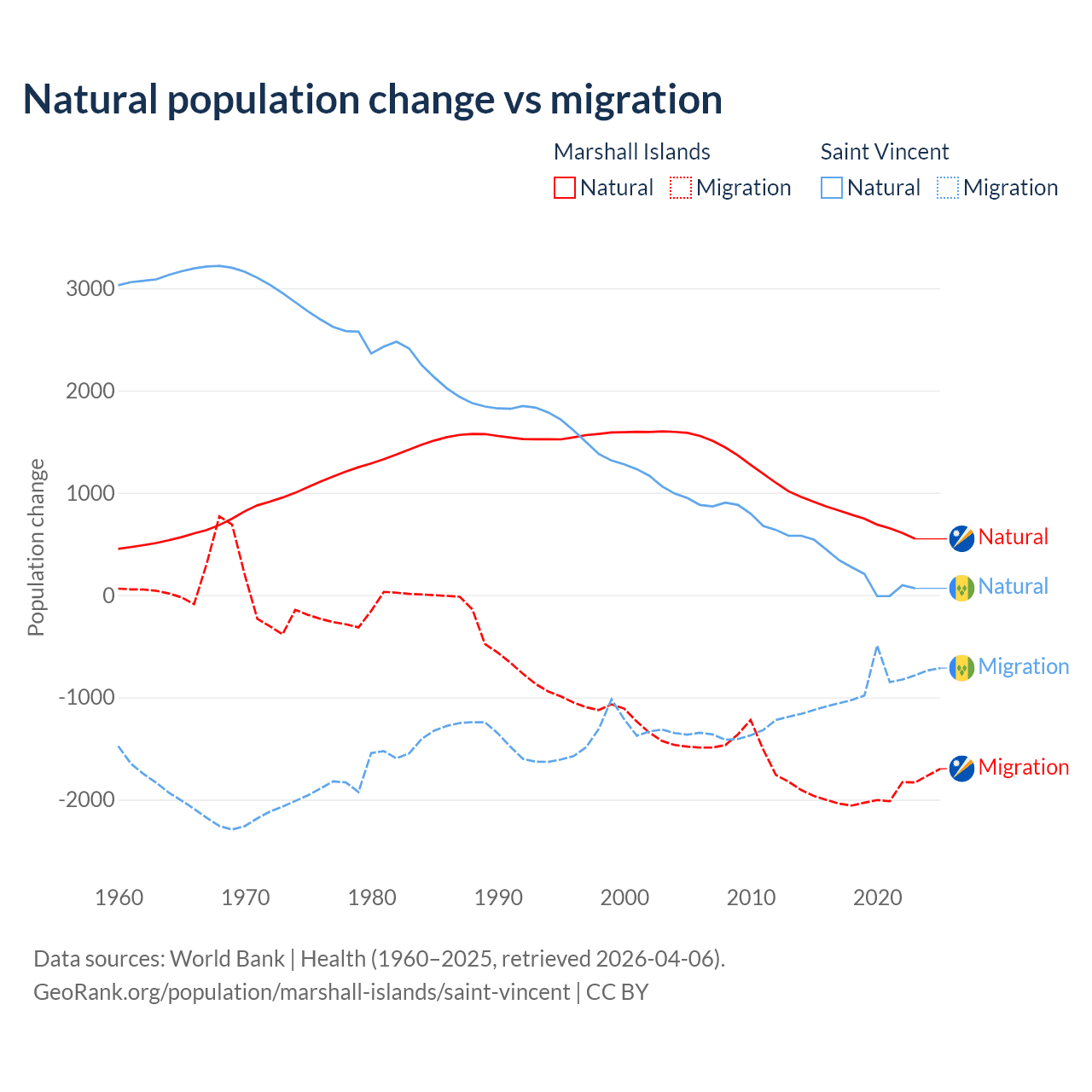Over the last 10 years, 27.8% of the population change in the Marshall Islands is from natural causes (a gain of 7,592 people) and 72.2% is from migration (a loss of 19,682 people). In Saint Vincent 21.2% is from natural causes (a gain of 2,525 people) and 78.8% is from migration (a loss of 9,393 people).