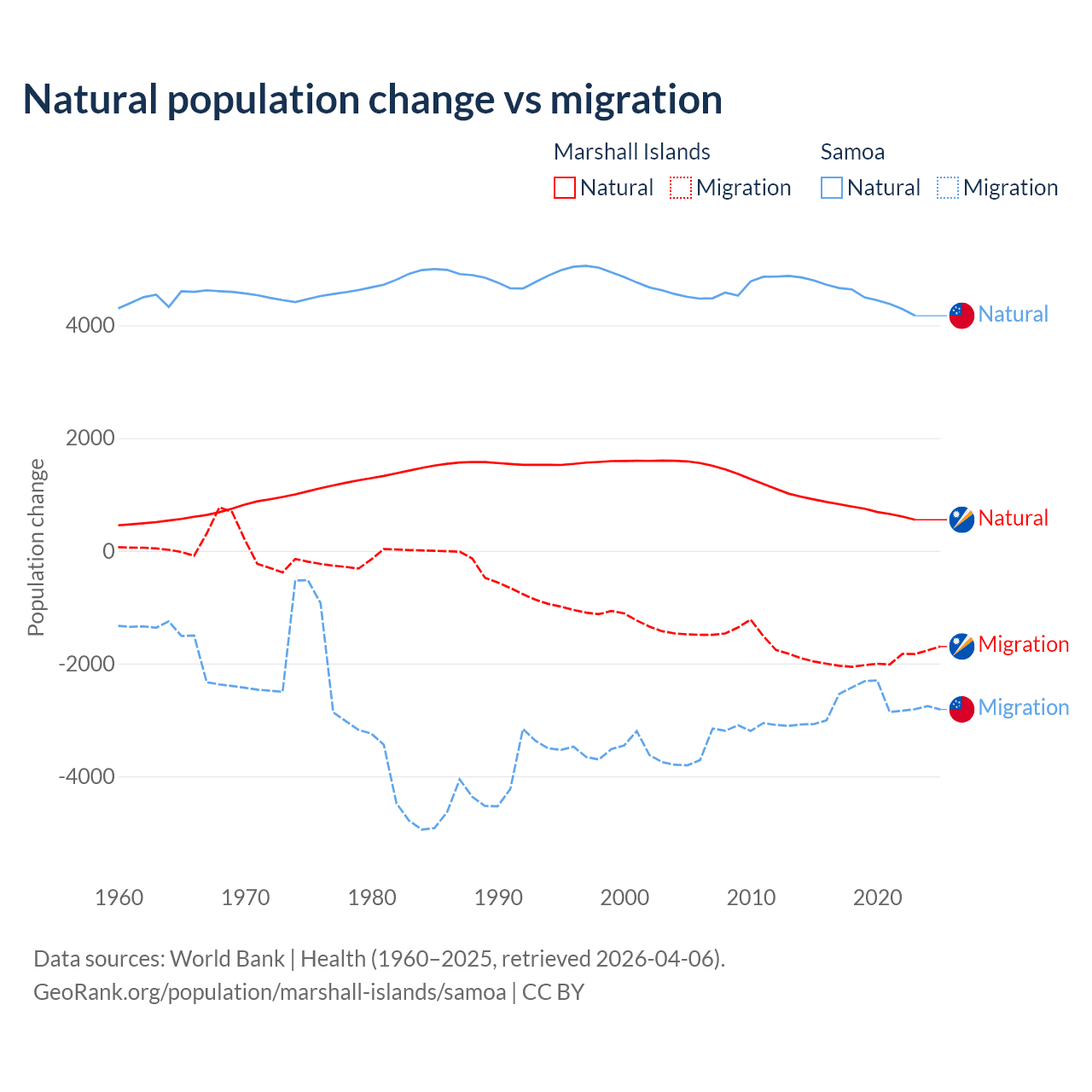 Over the last 10 years, 27.8% of the population change in the Marshall Islands is from natural causes (a gain of 7,592 people) and 72.2% is from migration (a loss of 19,682 people). In Samoa 62.5% is from natural causes (a gain of 45,436 people) and 37.5% is from migration (a loss of 27,246 people).