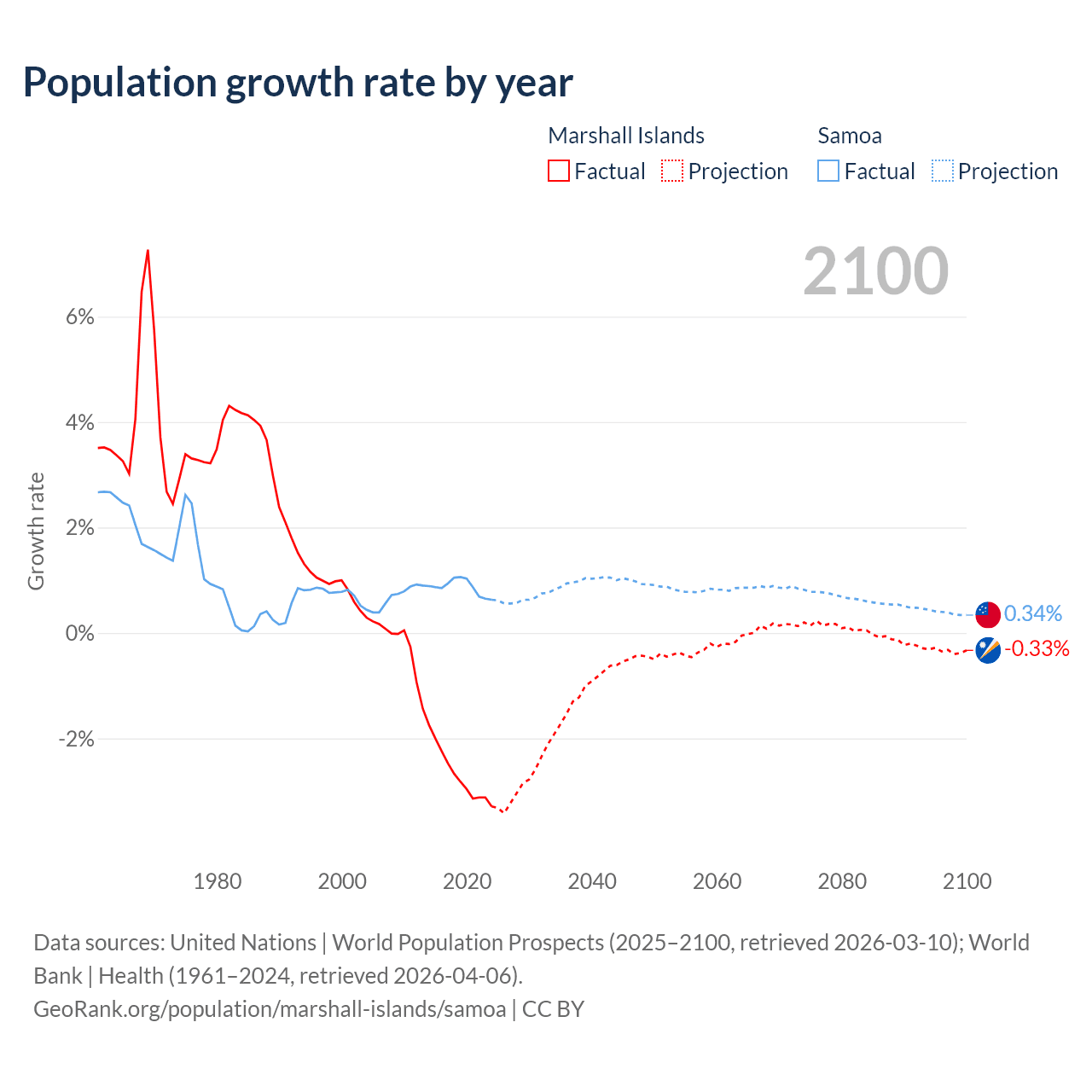 - For the last 10 years, the Marshall Islands has had an average growth rate of -2.69% per year vs +0.87% in Samoa.