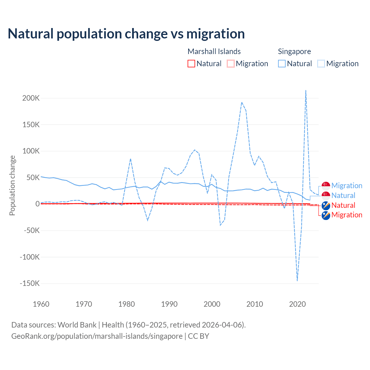 Over the last 10 years, 27.8% of the population change in the Marshall Islands is from natural causes (a gain of 7,592 people) and 72.2% is from migration (a loss of 19,682 people). In Singapore 54.8% is from natural causes (a gain of 195,953 people) and 45.2% is from migration (a gain of 161,805 people).