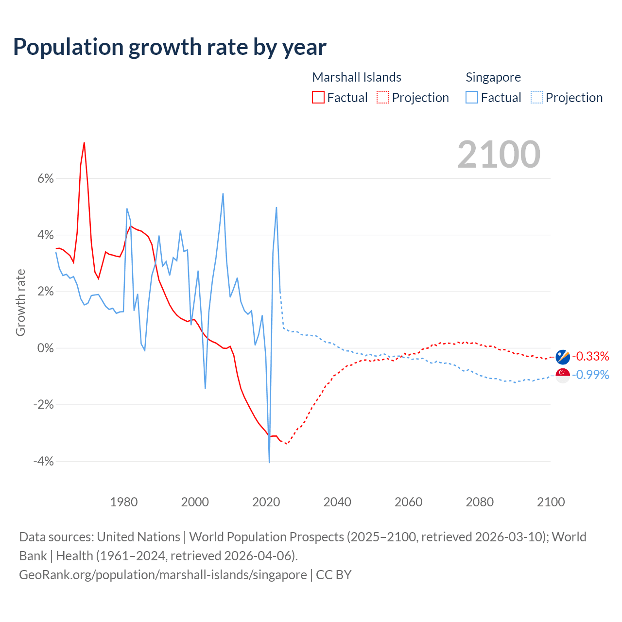 - For the last 10 years, the Marshall Islands has had an average growth rate of -2.69% per year vs +1.04% in Singapore.