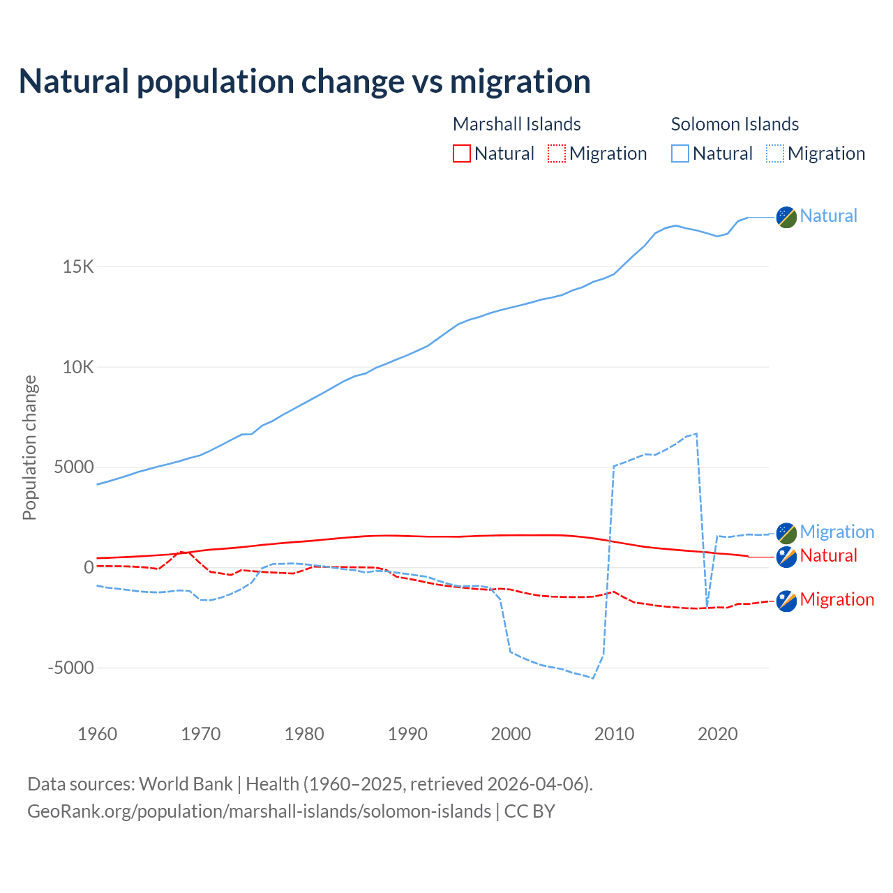Over the last 10 years, 27.8% of the population change in the Marshall Islands is from natural causes (a gain of 7,592 people) and 72.2% is from migration (a loss of 19,682 people). In the Solomon Islands 82.8% is from natural causes (a gain of 168,727 people) and 17.2% is from migration (a gain of 35,031 people).
