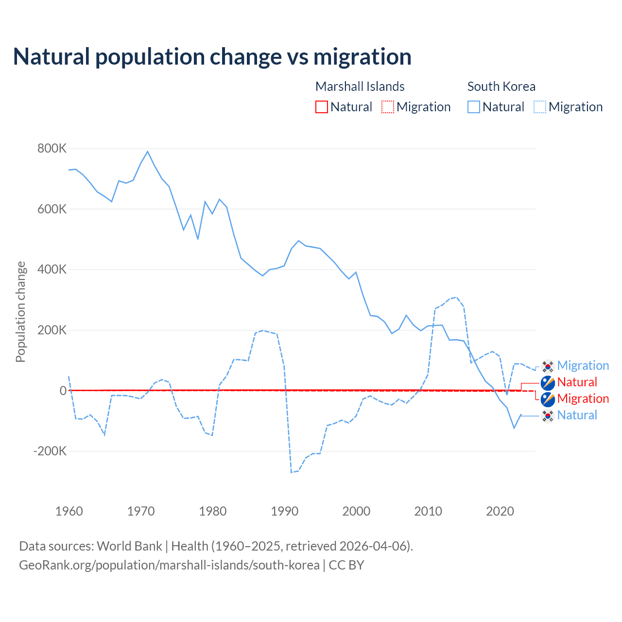 Over the last 10 years, 27.8% of the population change in the Marshall Islands is from natural causes (a gain of 7,592 people) and 72.2% is from migration (a loss of 19,682 people). In South Korea 17.6% is from natural causes (a gain of 277,215 people) and 82.4% is from migration (a gain of 1,298,356 people).