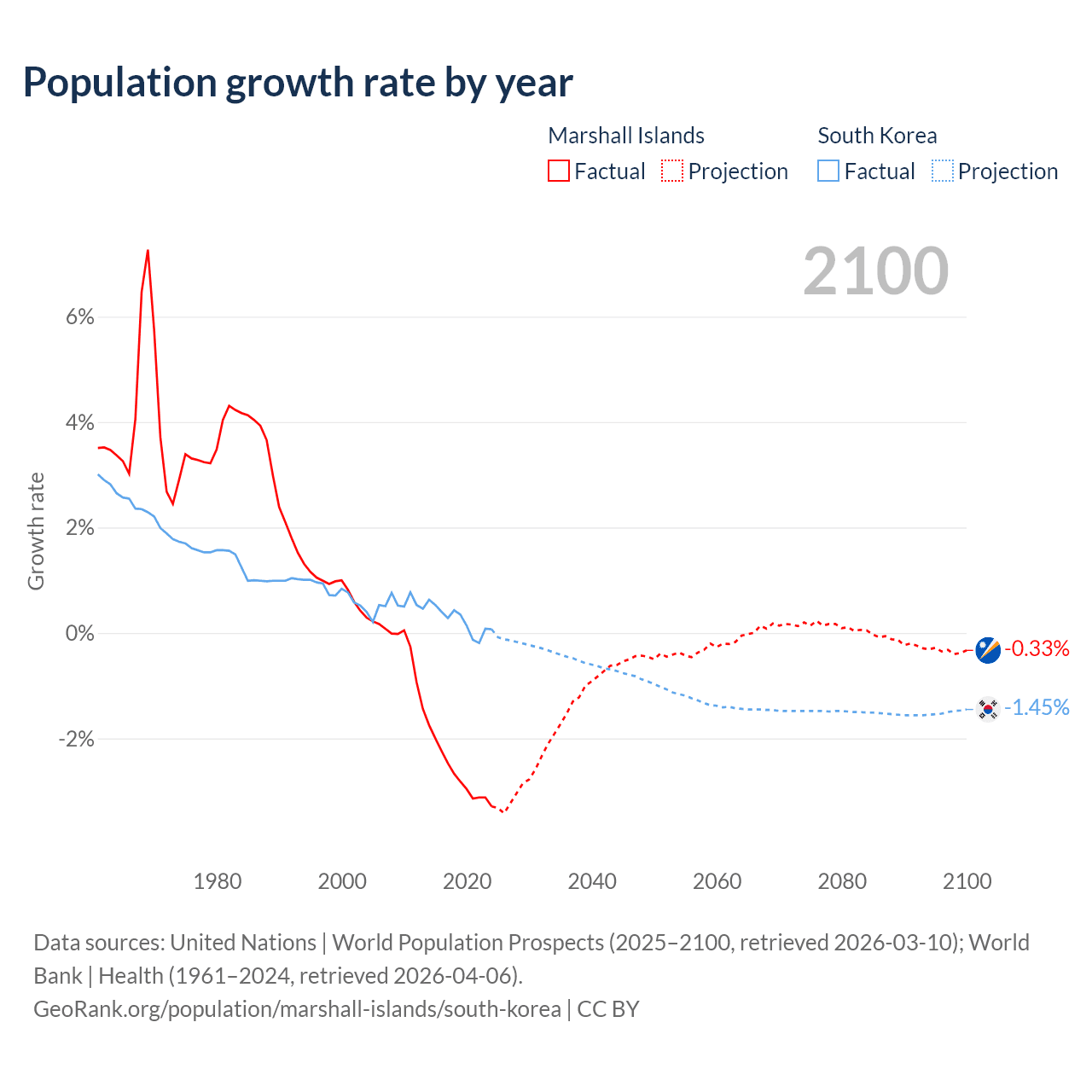 - Since 2006, the population of the Marshall Islands has decreased from 52K people to 35.1K (32.6% decline), while South Korea has grown from 48.4M to 51.6M (6.63% growth).