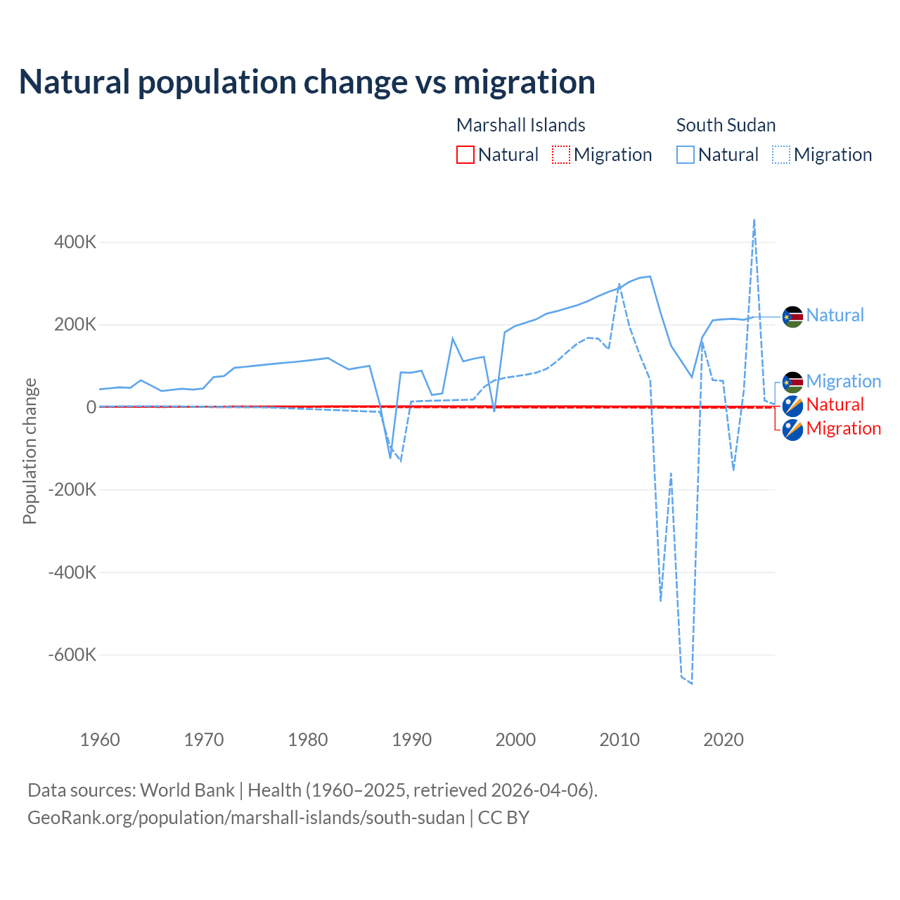 Over the last 10 years, 27.8% of the population change in the Marshall Islands is from natural causes (a gain of 7,592 people) and 72.2% is from migration (a loss of 19,682 people). In South Sudan 57.4% is from natural causes (a gain of 1,792,135 people) and 42.6% is from migration (a loss of 1,329,606 people).