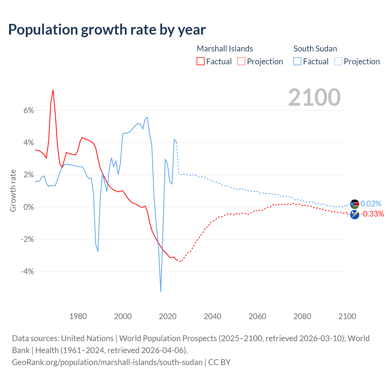 - For the last 10 years, the Marshall Islands has had an average growth rate of -2.69% per year vs +0.65% in South Sudan.