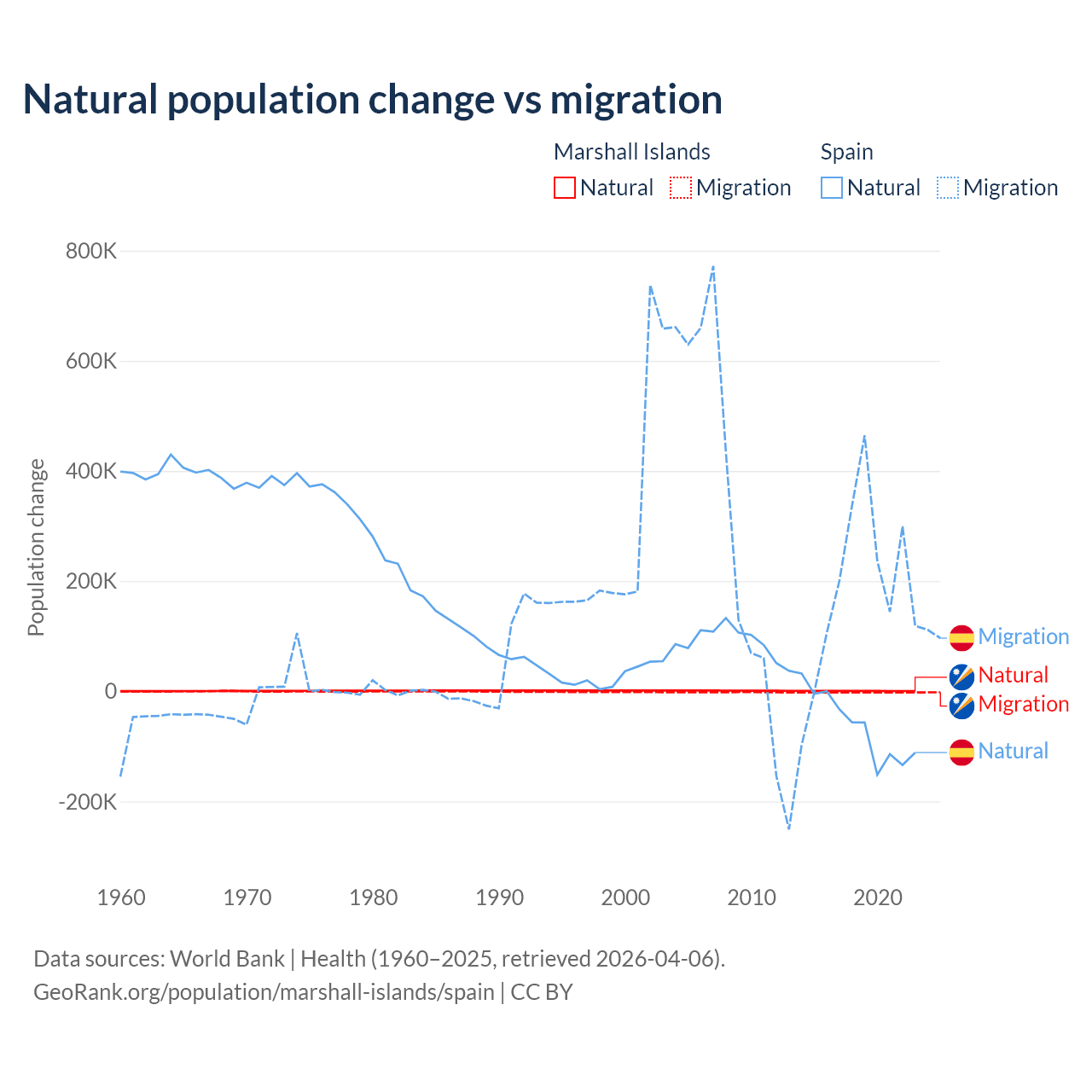 Over the last 10 years, 27.8% of the population change in the Marshall Islands is from natural causes (a gain of 7,592 people) and 72.2% is from migration (a loss of 19,682 people). In Spain 25.8% is from natural causes (a loss of 627,829 people) and 74.2% is from migration (a gain of 1,810,127 people).
