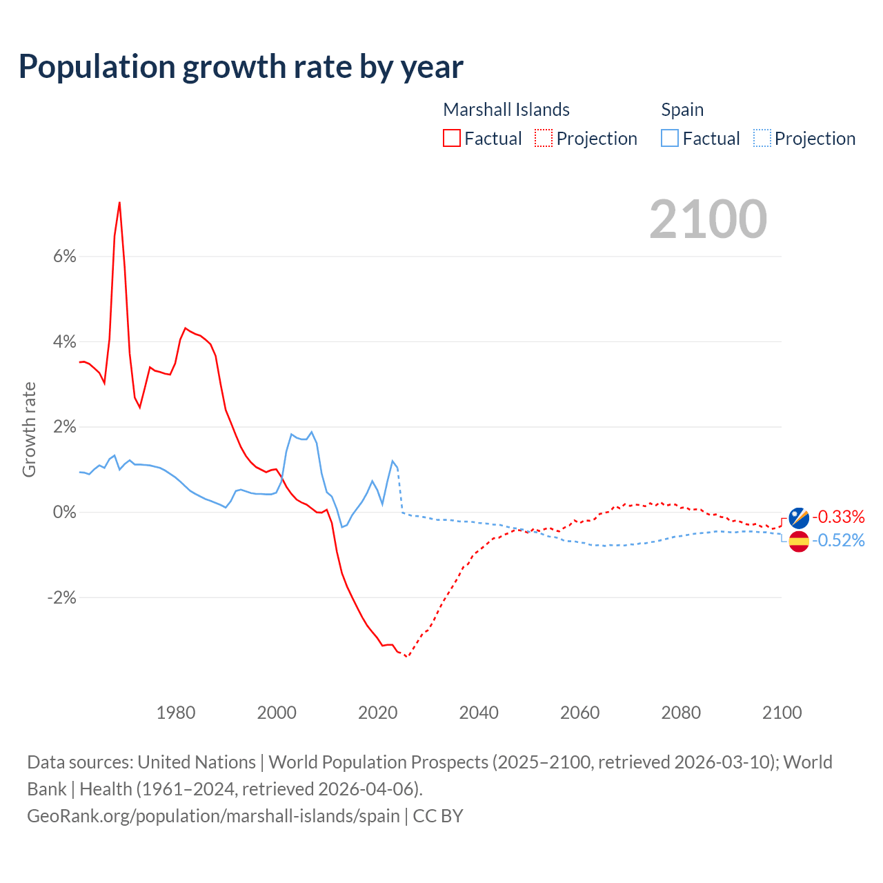 - For the last 10 years, the Marshall Islands has had an average growth rate of -2.69% per year vs +0.43% in Spain.