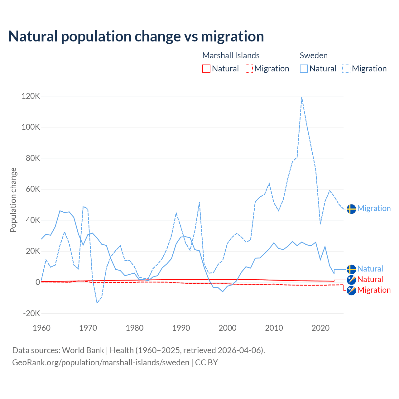 Over the last 10 years, 27.8% of the population change in the Marshall Islands is from natural causes (a gain of 7,592 people) and 72.2% is from migration (a loss of 19,682 people). In Sweden 21.4% is from natural causes (a gain of 201,900 people) and 78.6% is from migration (a gain of 743,642 people).