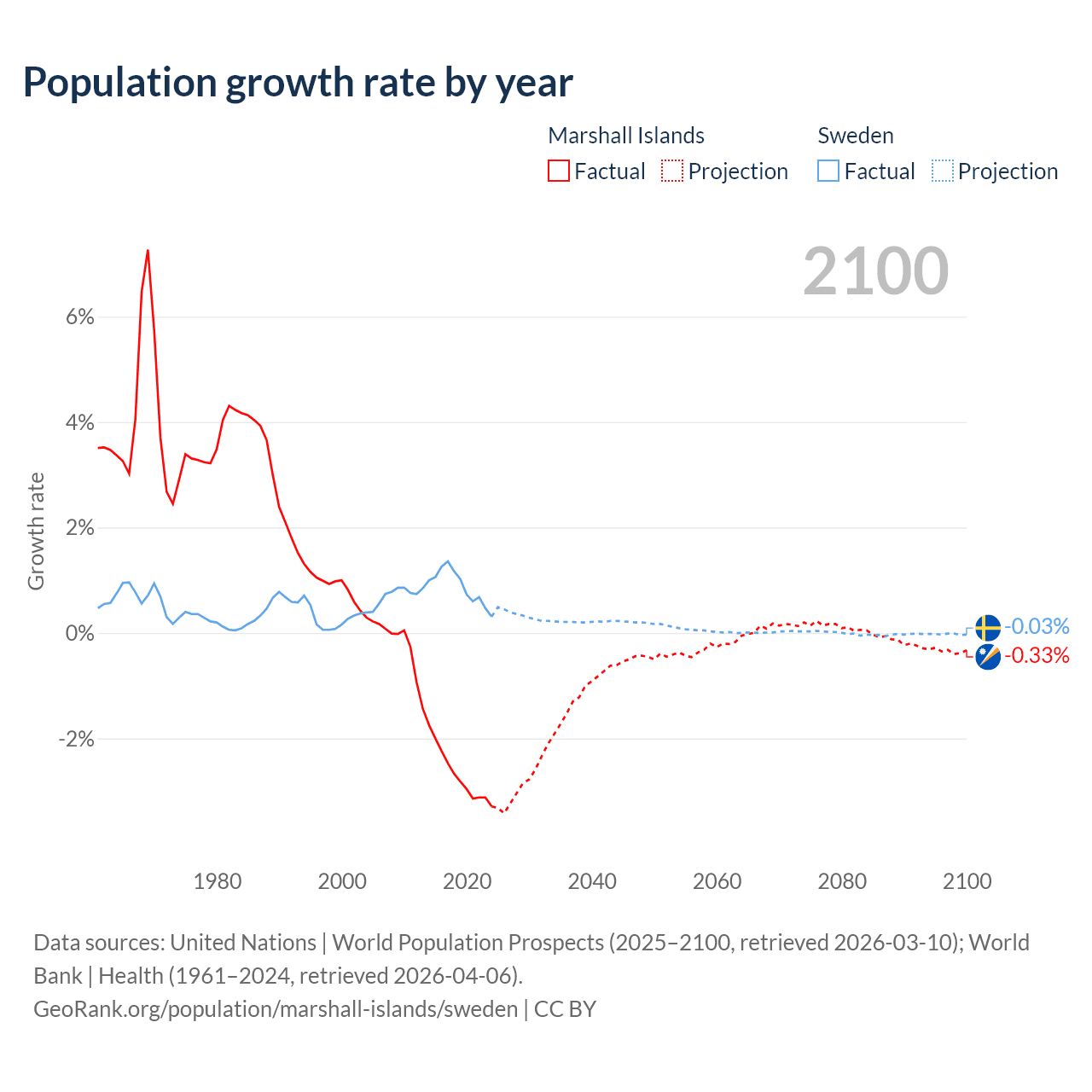 - Since 2006, the population of the Marshall Islands has decreased from 52K people to 35.1K (32.6% decline), while Sweden has grown from 9.08M to 10.7M (17.6% growth).