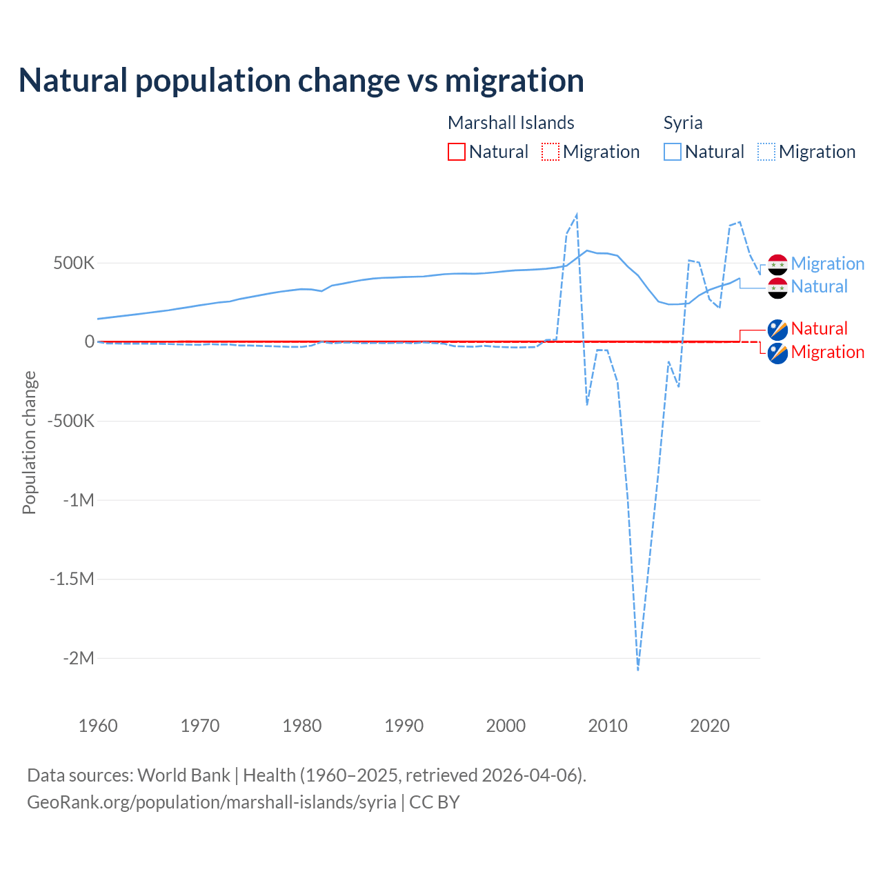 Over the last 10 years, 27.8% of the population change in the Marshall Islands is from natural causes (a gain of 7,592 people) and 72.2% is from migration (a loss of 19,682 people). In Syria 91.3% is from natural causes (a gain of 3,047,621 people) and 8.72% is from migration (a gain of 291,069 people).