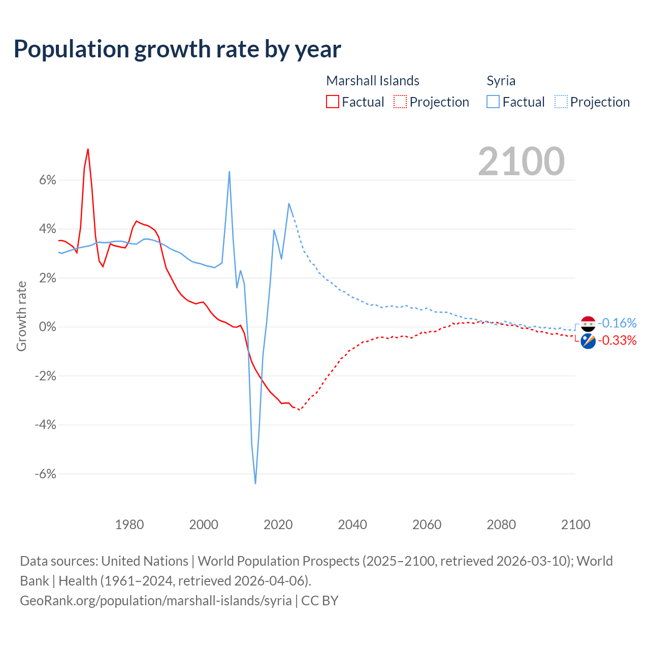 - For the last 10 years, the Marshall Islands has had an average growth rate of -2.69% per year vs +1.25% in Syria.