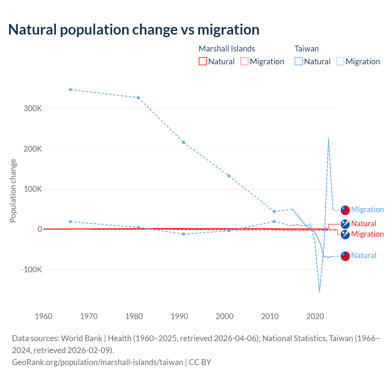 Over the last 10 years, 27.8% of the population change in the Marshall Islands is from natural causes (a gain of 7,592 people) and 72.2% is from migration (a loss of 19,682 people). In Taiwan 56.7% is from natural causes (a loss of 57,467 people) and 43.3% is from migration (a gain of 43,884 people).