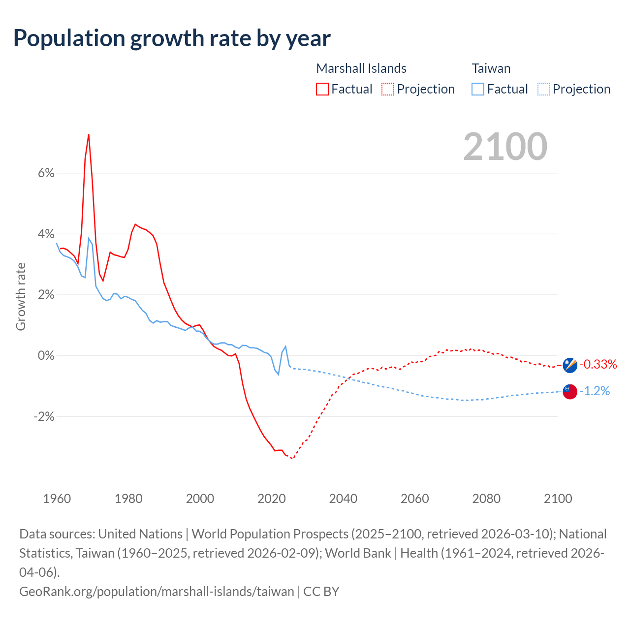 - For the last 10 years, the Marshall Islands has had an average growth rate of -2.69% per year vs -0.03% in Taiwan.
