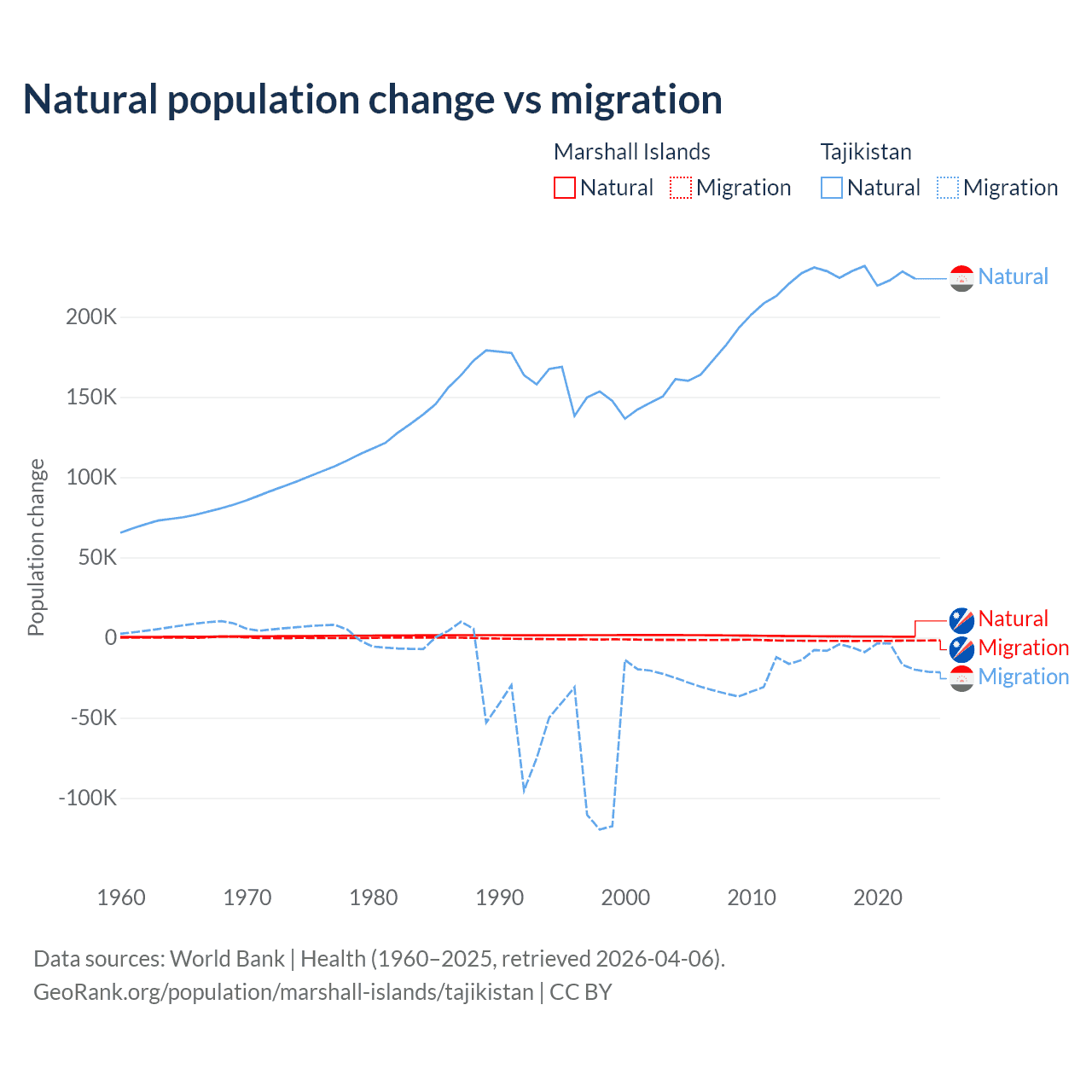 Over the last 10 years, 27.8% of the population change in the Marshall Islands is from natural causes (a gain of 7,592 people) and 72.2% is from migration (a loss of 19,682 people). In Tajikistan 96% is from natural causes (a gain of 2,266,045 people) and 3.95% is from migration (a loss of 93,205 people).
