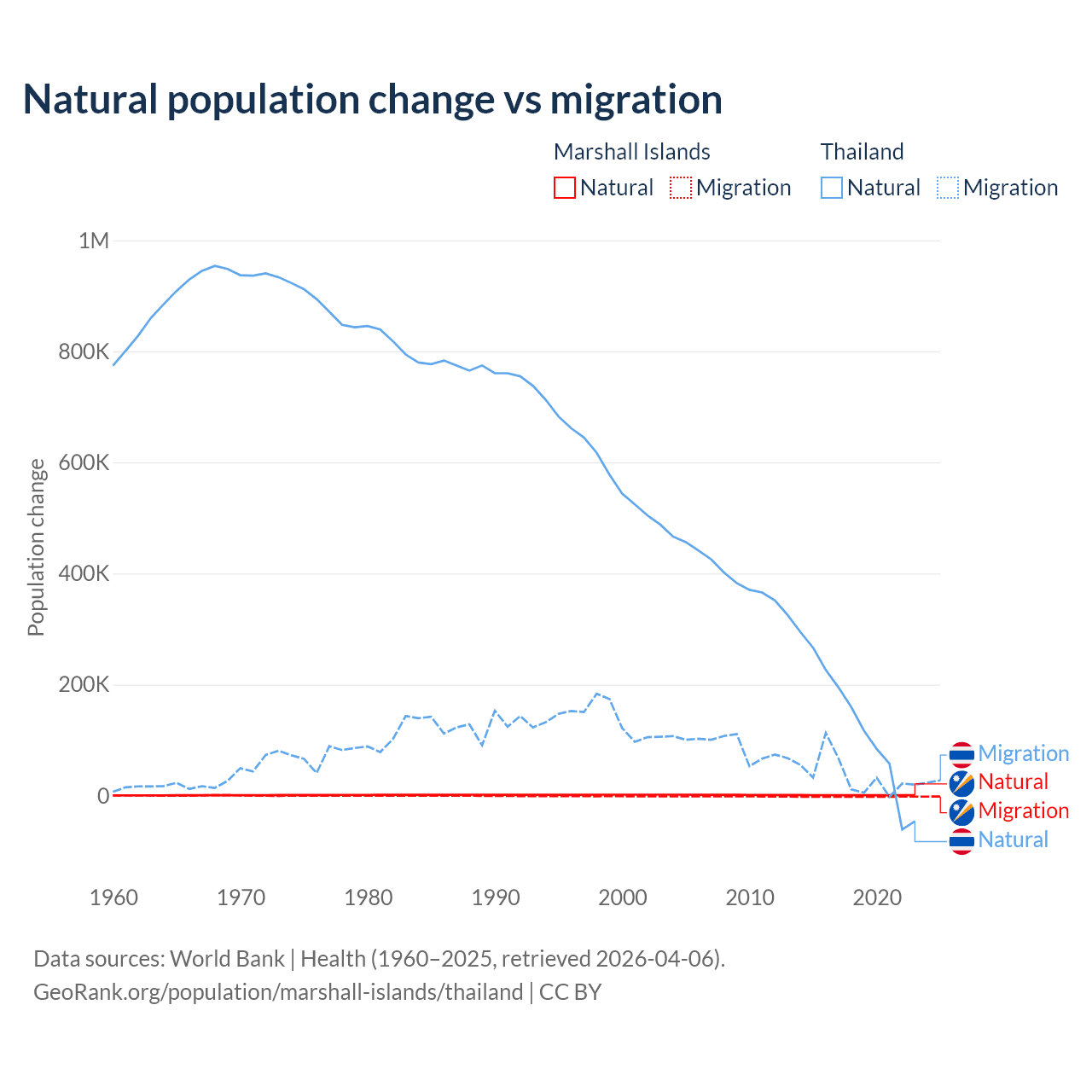 Over the last 10 years, 27.8% of the population change in the Marshall Islands is from natural causes (a gain of 7,592 people) and 72.2% is from migration (a loss of 19,682 people). In Thailand 78.4% is from natural causes (a gain of 1,292,528 people) and 21.6% is from migration (a gain of 355,361 people).