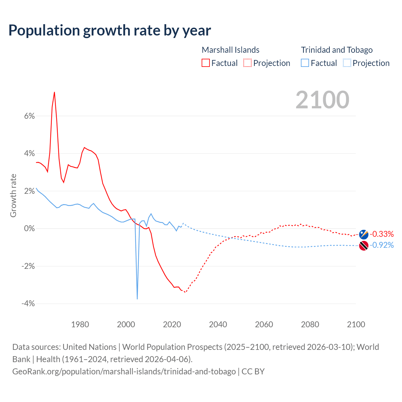 - For the last 10 years, the Marshall Islands has had an average growth rate of -2.69% per year vs +0.19% in Trinidad and Tobago.