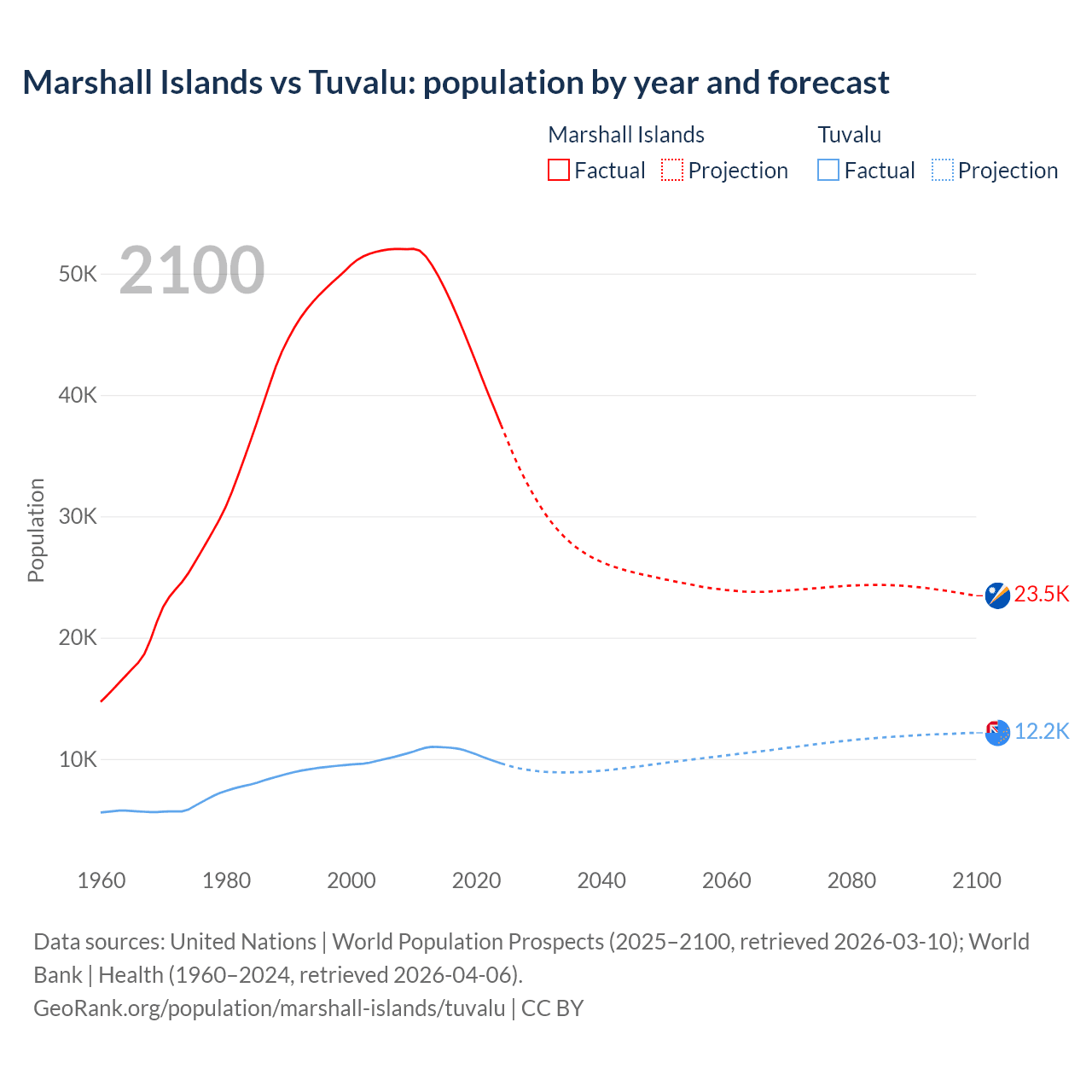 Marshall Islands vs Tuvalu: population by year and forecast
