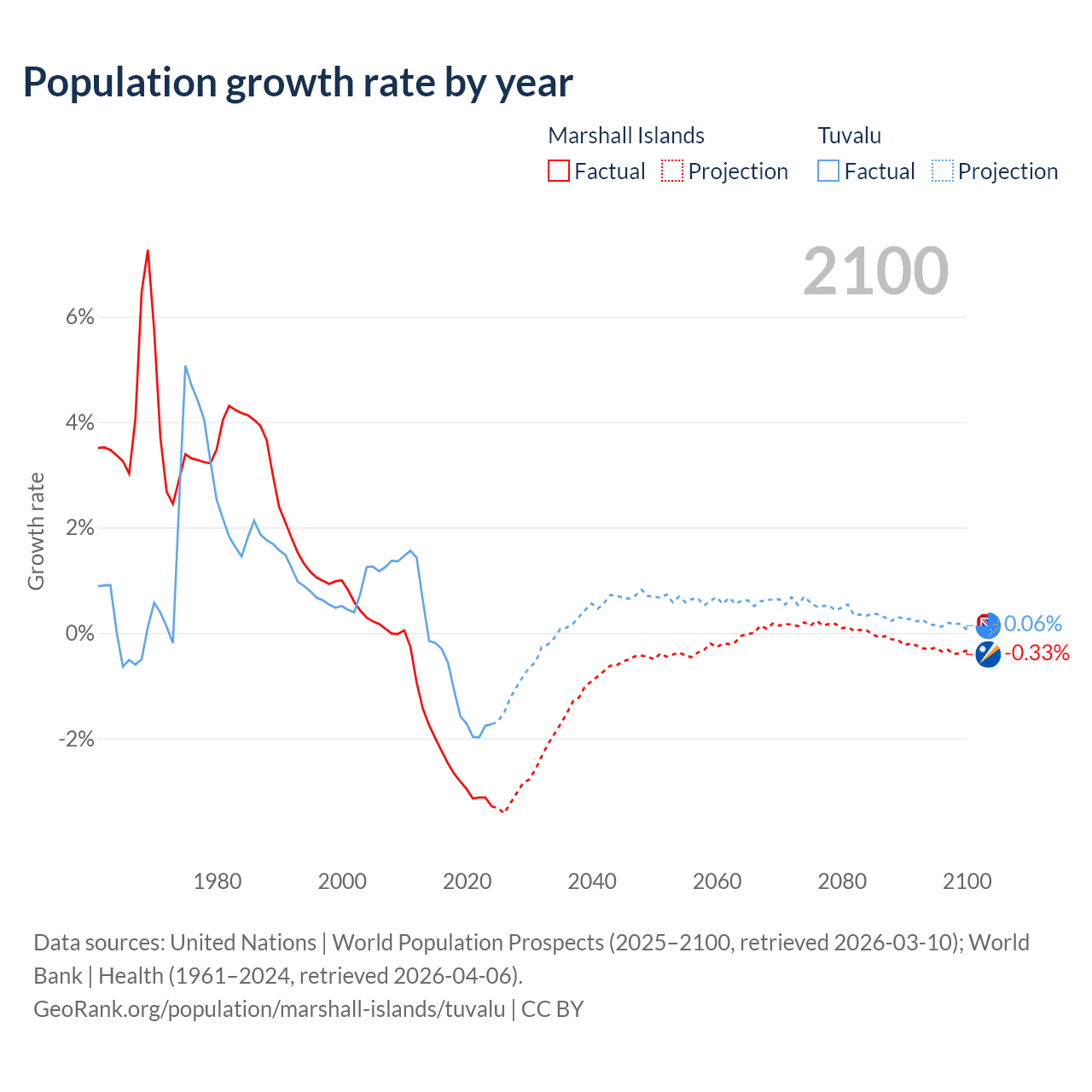 - For the last 10 years, the Marshall Islands has had an average growth rate of -2.69% per year vs -1.19% in Tuvalu.