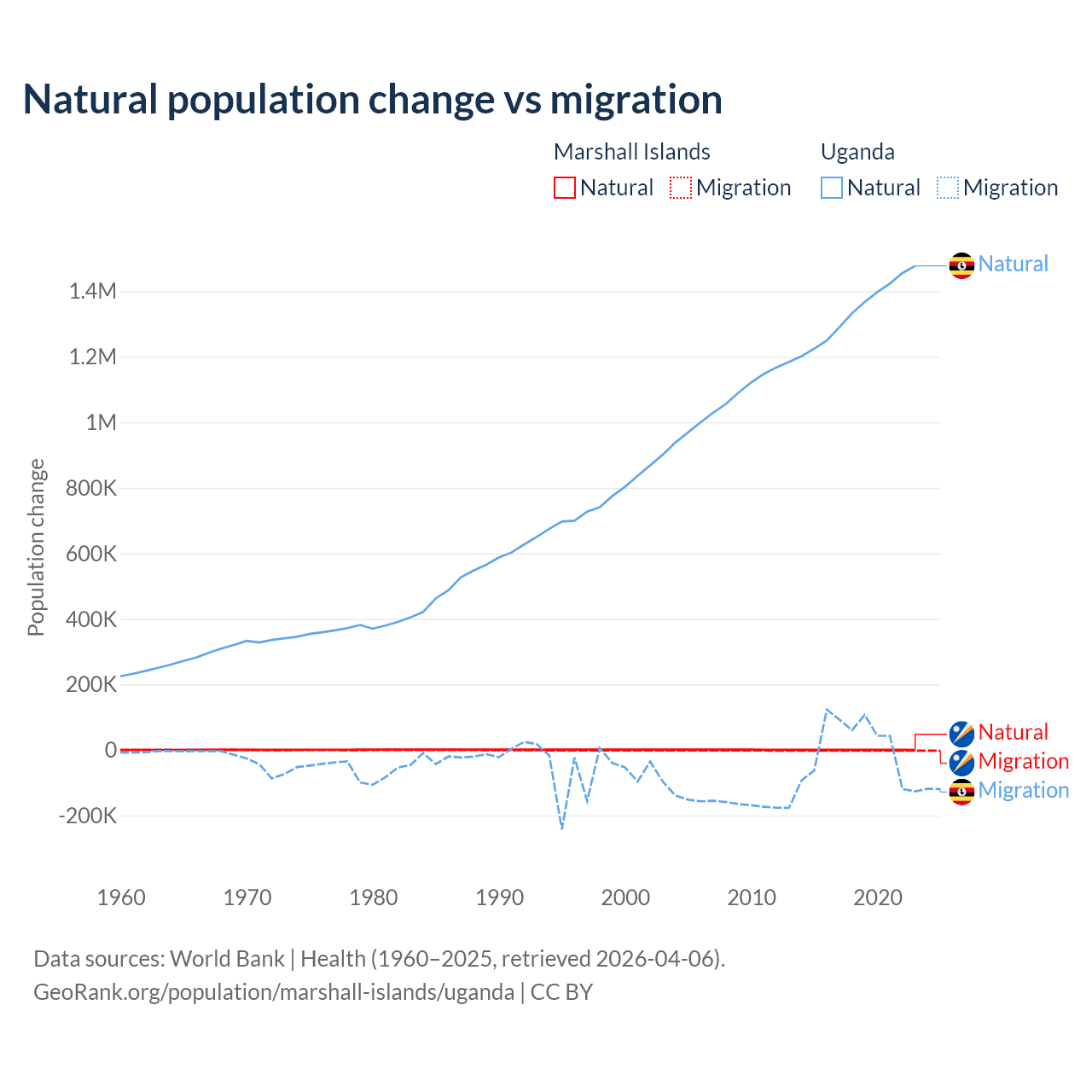 Over the last 10 years, 27.8% of the population change in the Marshall Islands is from natural causes (a gain of 7,592 people) and 72.2% is from migration (a loss of 19,682 people). In Uganda 99.5% is from natural causes (a gain of 13,419,712 people) and 0.53% is from migration (a gain of 71,457 people).