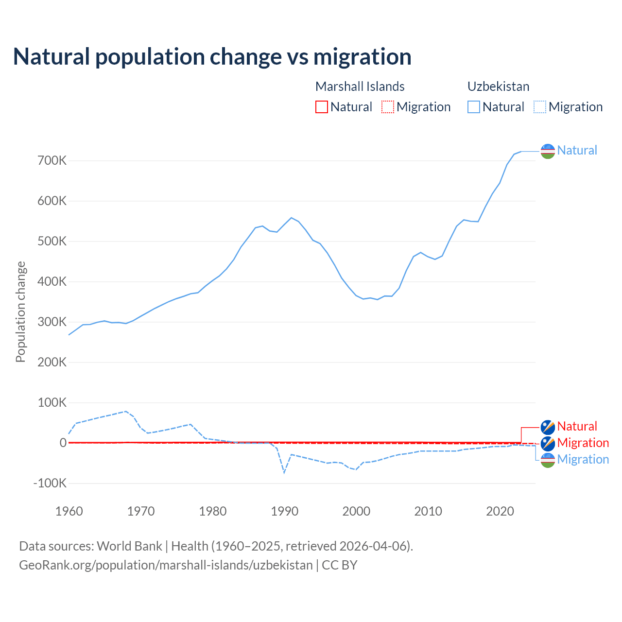 Over the last 10 years, 27.8% of the population change in the Marshall Islands is from natural causes (a gain of 7,592 people) and 72.2% is from migration (a loss of 19,682 people). In Uzbekistan 98.2% is from natural causes (a gain of 6,161,117 people) and 1.84% is from migration (a loss of 115,398 people).