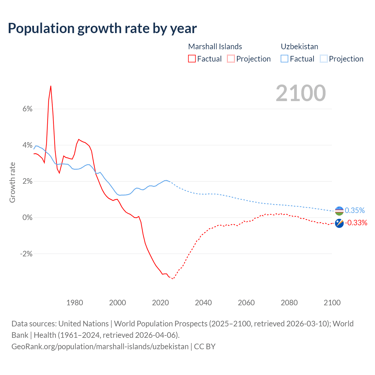 - For the last 10 years, the Marshall Islands has had an average growth rate of -2.69% per year vs +1.85% in Uzbekistan.