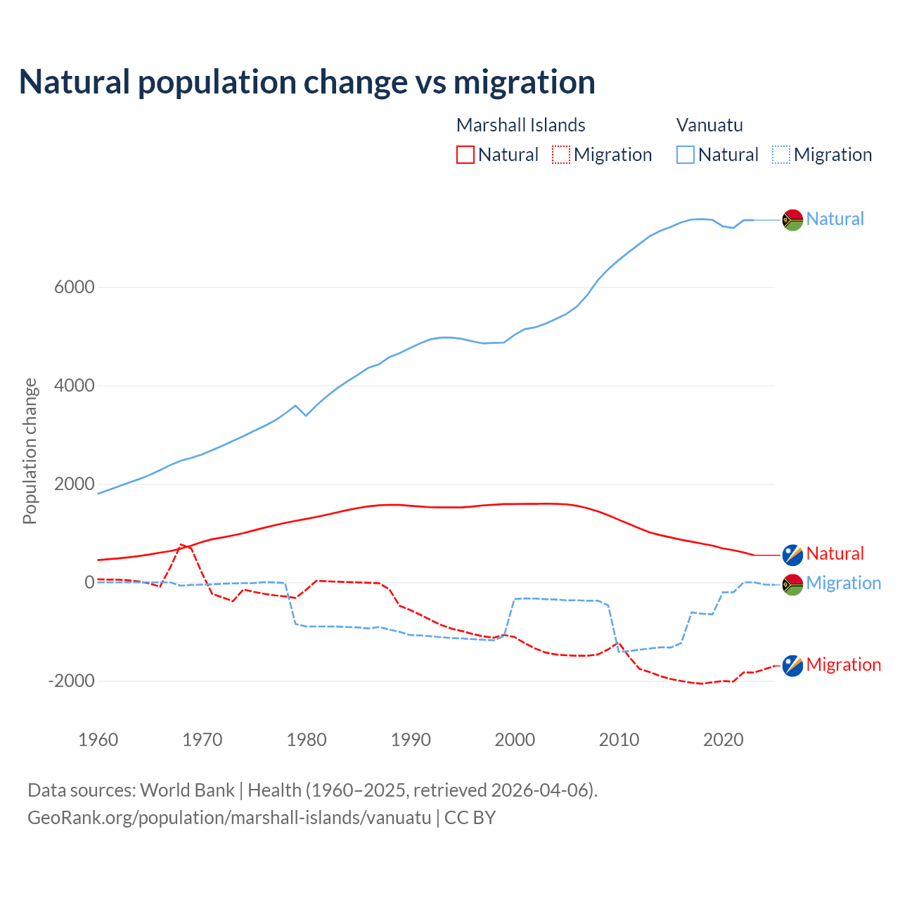 Over the last 10 years, 27.8% of the population change in the Marshall Islands is from natural causes (a gain of 7,592 people) and 72.2% is from migration (a loss of 19,682 people). In Vanuatu 92.2% is from natural causes (a gain of 72,941 people) and 7.81% is from migration (a loss of 6,181 people).