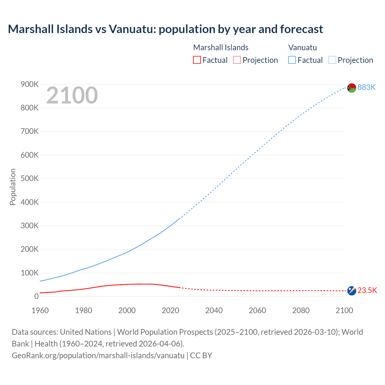 - Since 2006, the population of the Marshall Islands has decreased from 52K people to 35.1K (32.6% decline), while Vanuatu has grown from 216K to 345K (59.7% growth).