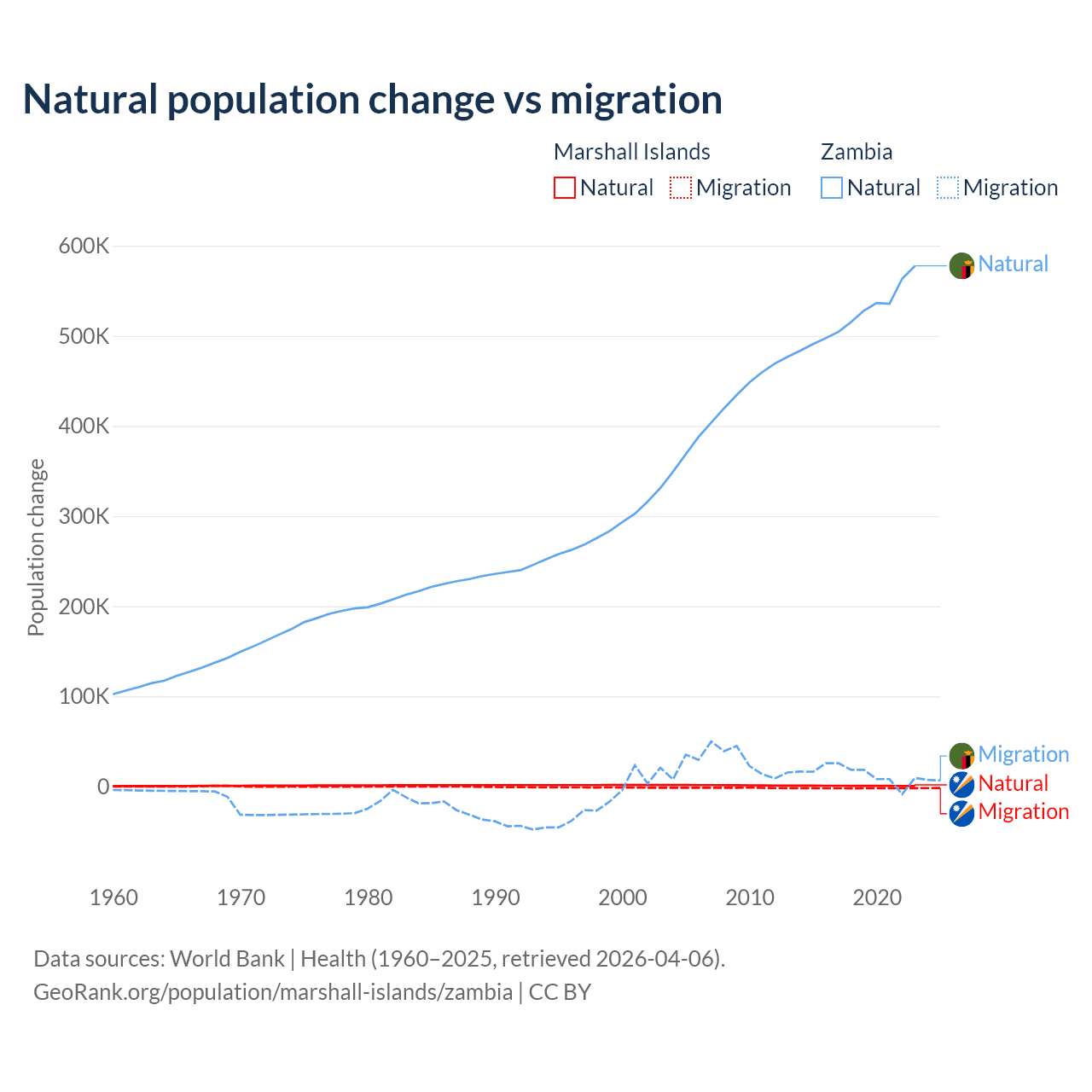 Over the last 10 years, 27.8% of the population change in the Marshall Islands is from natural causes (a gain of 7,592 people) and 72.2% is from migration (a loss of 19,682 people). In Zambia 97.4% is from natural causes (a gain of 5,233,797 people) and 2.58% is from migration (a gain of 138,554 people).