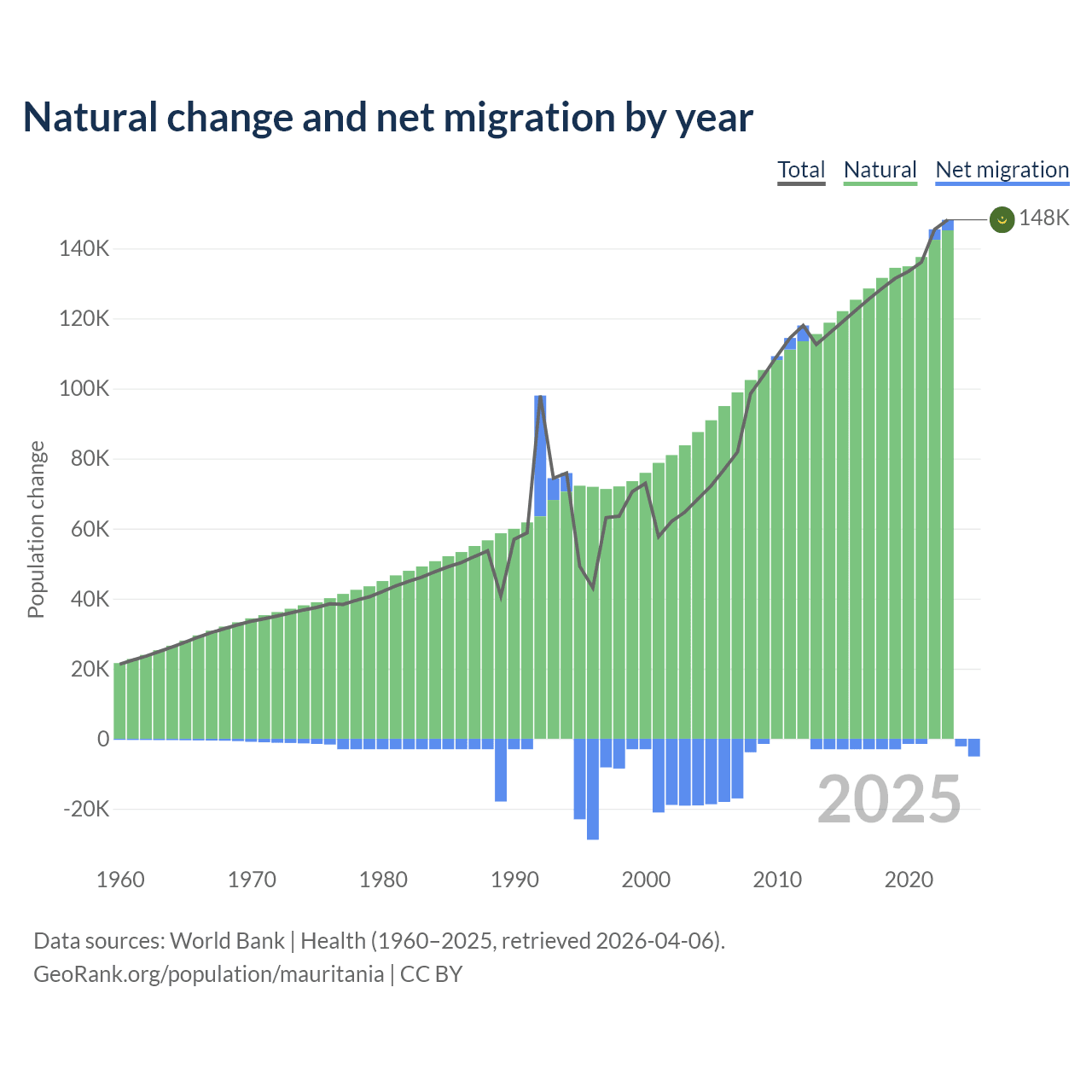 Over the last 10 years, 98.9% of the population change in Mauritania is from natural causes (a gain of 1,320,903 people) and 1.12% is from migration (a loss of 14,982 people).