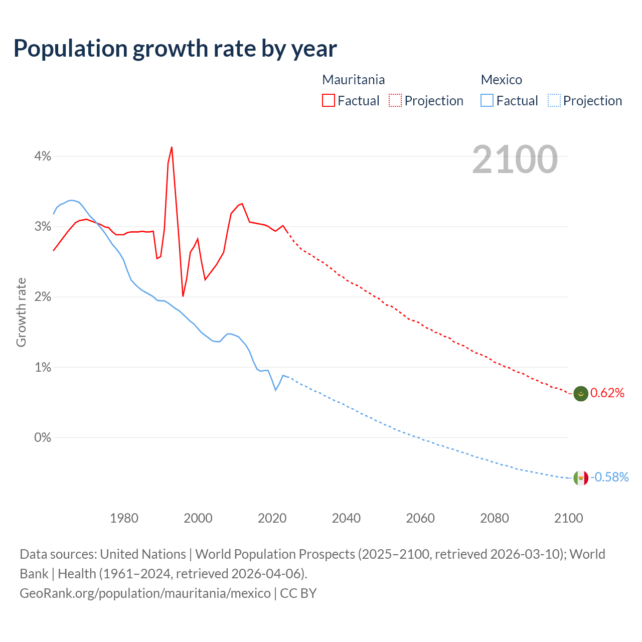 - For the last 10 years, Mauritania has had an average growth rate of +3% per year vs +0.92% in Mexico.