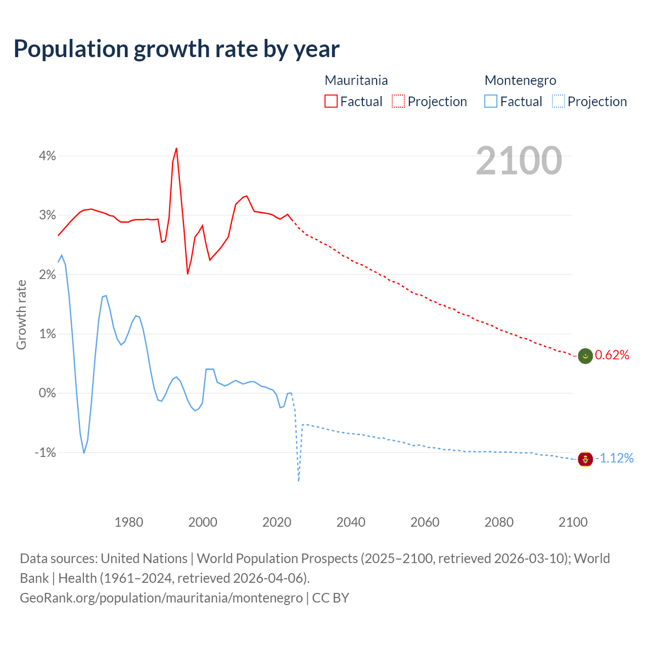 - For the last 10 years, Mauritania has had an average growth rate of +3% per year vs +0.01% in Montenegro.