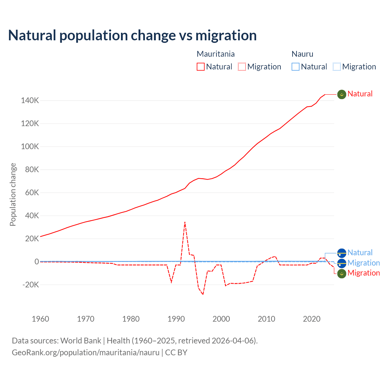 Over the last 10 years, 98.9% of the population change in Mauritania is from natural causes (a gain of 1,320,903 people) and 1.12% is from migration (a loss of 14,982 people). In Nauru 66.2% is from natural causes (a gain of 2,590 people) and 33.8% is from migration (a loss of 1,320 people).