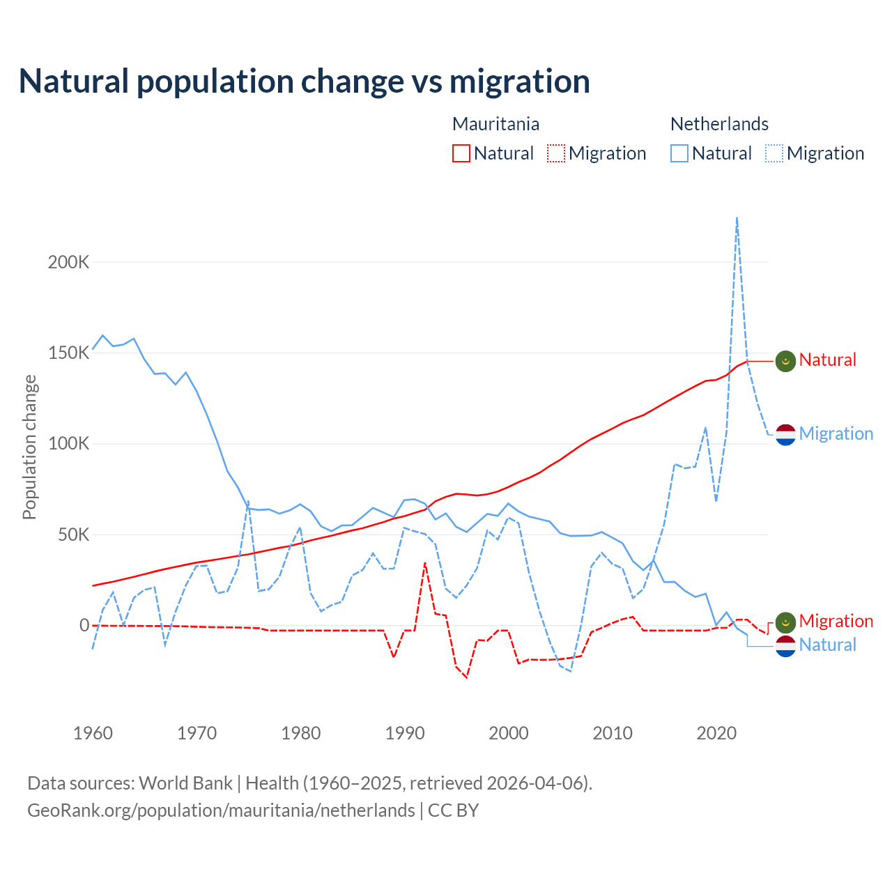 Over the last 10 years, 98.9% of the population change in Mauritania is from natural causes (a gain of 1,320,903 people) and 1.12% is from migration (a loss of 14,982 people). In the Netherlands 11.8% is from natural causes (a gain of 134,554 people) and 88.2% is from migration (a gain of 1,006,495 people).