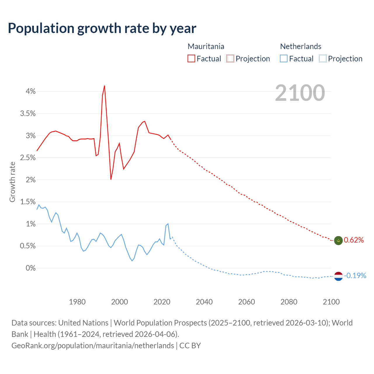 - For the last 10 years, Mauritania has had an average growth rate of +3% per year vs +0.62% in the Netherlands.