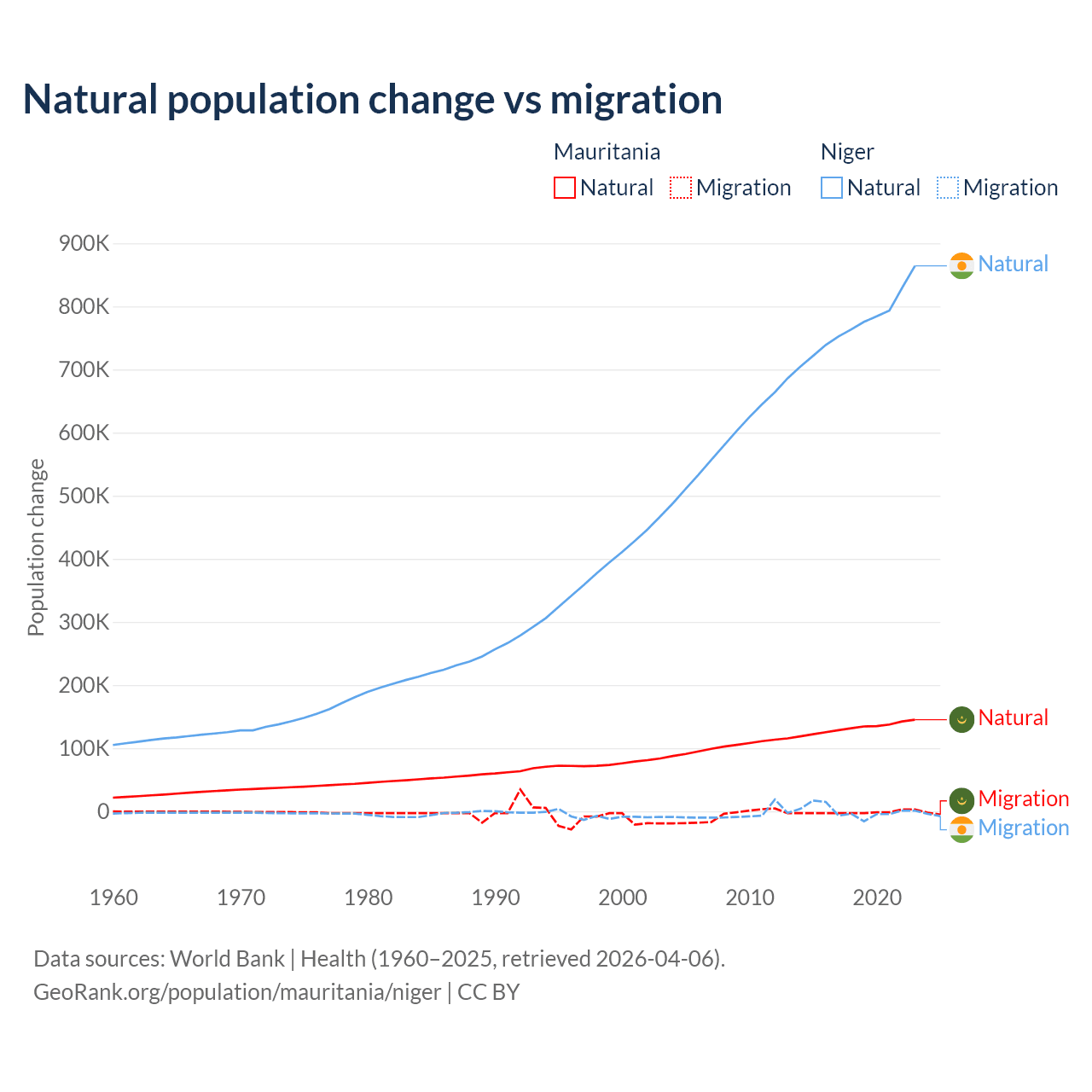 Over the last 10 years, 98.9% of the population change in Mauritania is from natural causes (a gain of 1,320,903 people) and 1.12% is from migration (a loss of 14,982 people). In Niger 100% is from natural causes (a gain of 7,728,287 people) and 0.03% is from migration (a gain of 2,520 people).