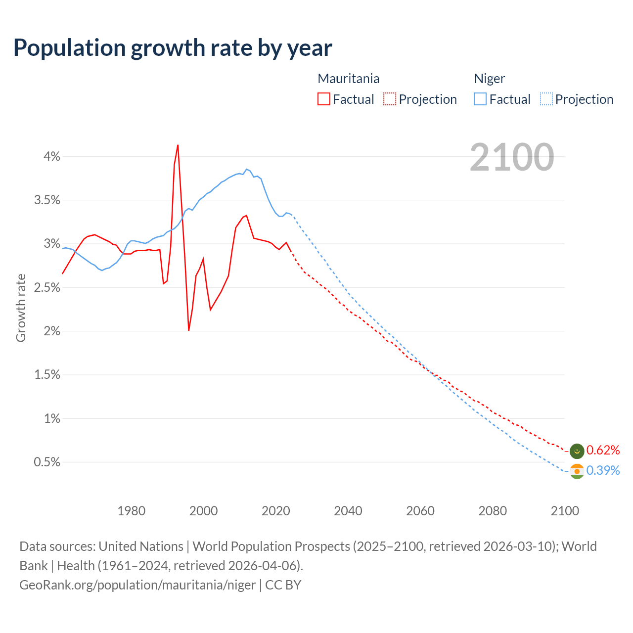 Mauritania vs Niger: population by year and forecast